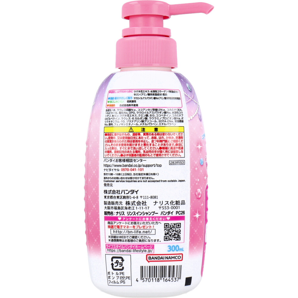 | 素材 | 【化粧品】 販売名:ナリス リンスインシャンプー バンダイ PC26 【全成分】 水、ラウレス硫酸Na、ココアンホジ酢酸2Na、コカミドDEA、ソルビトール、塩化Na、DPG、ラウロイルアスパラギン酸Na、水溶性コラーゲン、セリン、ツバキ花エキス、クエン酸、BG、ココベタイン、コカミドプロピルベタイン、ラウレス-6カルボン酸、ラウラミノプロピオン酸Na、ポリクオタニウム-10、ジステアリン酸グリコール、EDTA-2Na、安息香酸Na、香料、フェノキシエタノール、メチルパラベン、エチルパラベン 【使用方法】 ・適量でシャンプーし、洗い流してください。 ★ポンプの使い方 ・使い始めはポンプ下部を片手でおさえながら、ノズルを反時計回りの方向に回し、上げてください。 ・ノズルを逆に回すとポンプが上がらなくなる場合があります。 |
