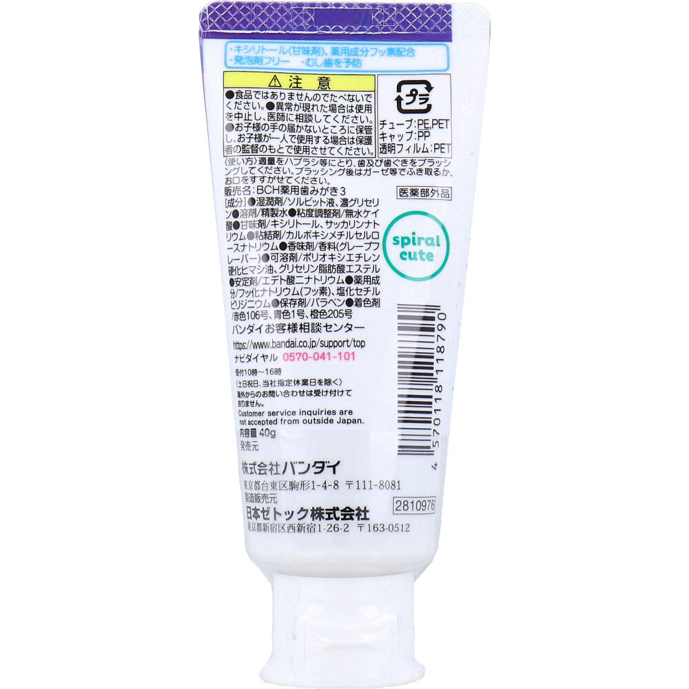| 素材 | 【医薬部外品】 販売名:BCH薬用歯みがき3 【成分】 湿潤剤:ソルビット液、濃グリセリン 溶剤:精製水 粘度調整剤:無水ケイ酸 甘味剤:キシリトール、サッカリンナトリウム 粘結剤:カルボキシメチルセルロースナトリウム 香味剤:香料(グレープフレーバー) 可溶剤:ポリオキシエチレン硬化ヒマシ油、グリセリン脂肪酸エステル 安定剤:エデト酸二ナトリウム 薬用成分:フッ化ナトリウム(フッ素)、塩化セチルピリジニウム 保存剤:パラベン 着色剤:赤色106号、青色1号、橙色205号 【使い方】 ・適量をハブラシ等にとり、歯及び歯ぐきをブラッシングしてください。 ・ブラッシング後はガーゼ等でふき取るか、お口をすすがせてください。 |