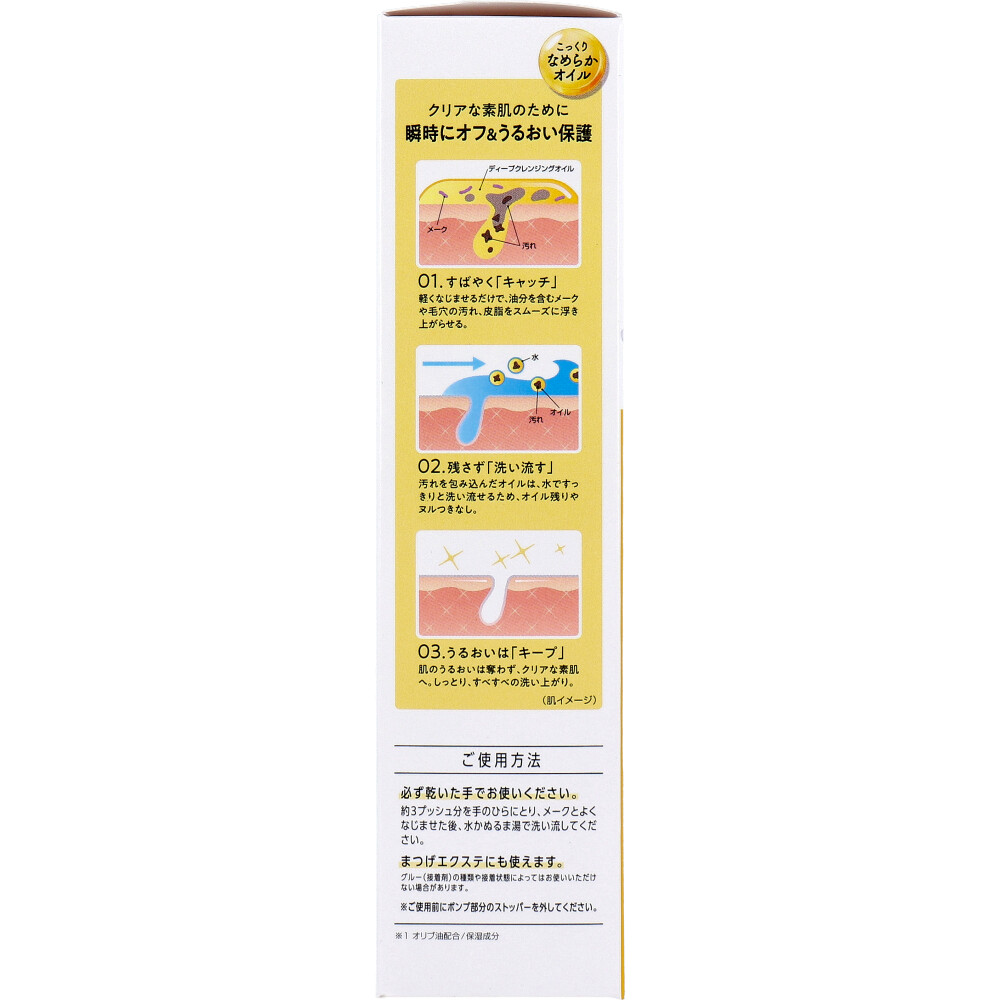 | 素材 | 【医薬部外品】 薬用ディープクレンジングオイル 【ご使用方法】 ・必ず乾いた手でお使いください。 約3プッシュ分を手のひらにとり、メークとよくなじませまた後、水かぬるま湯で洗い流してください。 ・まつげエクステにも使えます。 ※グルー(接着剤)の種類や接着状態によってはお使いいただけない場合があります。 |
