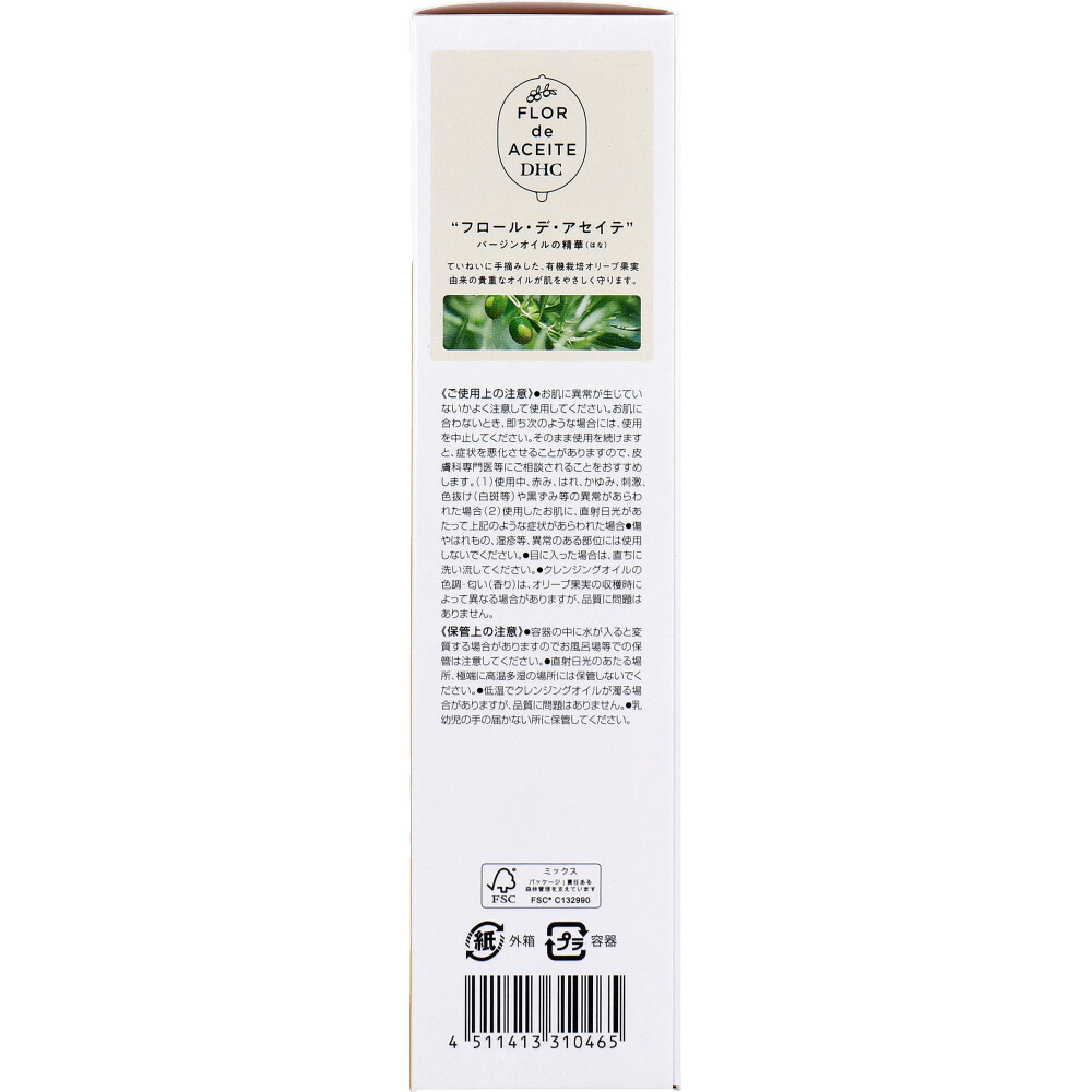| 注意事項 | 【ご使用上の注意】 ・お肌に異常が生じていないかよく注意して使用してください。お肌に合わないとき即ち次のような場合には、使用を中止してください。そのまま使用を続けますと、症状を悪化させることがありますので、皮膚科専門医等にご相談されることをおすすめします。 (1)使用中、赤み、はれ、かゆみ、刺激、色抜け(白斑等)や黒ずみ等の異常があらわれた場合。 (2)使用したお肌に、直射日光があたって上記のような症状があらわれた場合。 ・傷やはれもの、湿疹等、異常のある部位には使用しないでください。 ・目に入った場合は、直ちに洗い流してください。 ・クレンジングオイルの色調・匂い(香り)は、オリーブ果実の収穫時によって異なる場合がありますが、品質に問題はありません。 【保管上の注意】 ・容器の中に水が入ると変質する場合がありますのでお風呂場等での保管は注意してください。 ・直射日光のあたる場所、極端に高温多湿の場所には保管しないでください。 ・低温でクレンジングオイルが濁る場合がありますが、品質に問題はありません。 ・乳幼児の手の届かない所に保管してください。 |