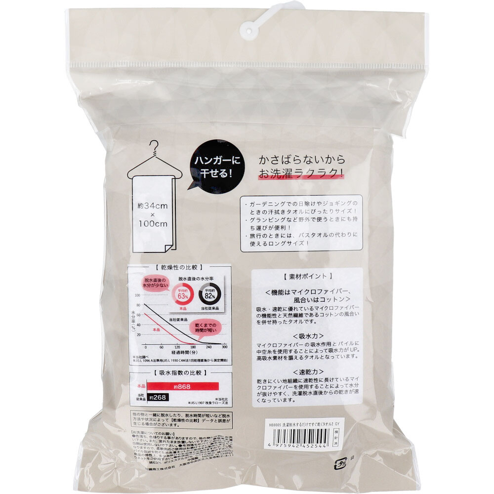洗濯脱水するだけですぐ乾くタオル2 ロングタオル 約34×100cm グレー 1枚入