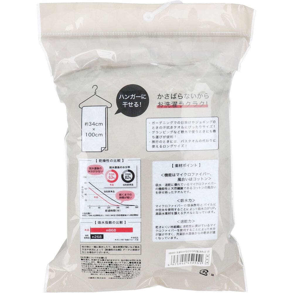 洗濯脱水するだけですぐ乾くタオル2 ロングタオル 約34×100cm グレー 1枚入