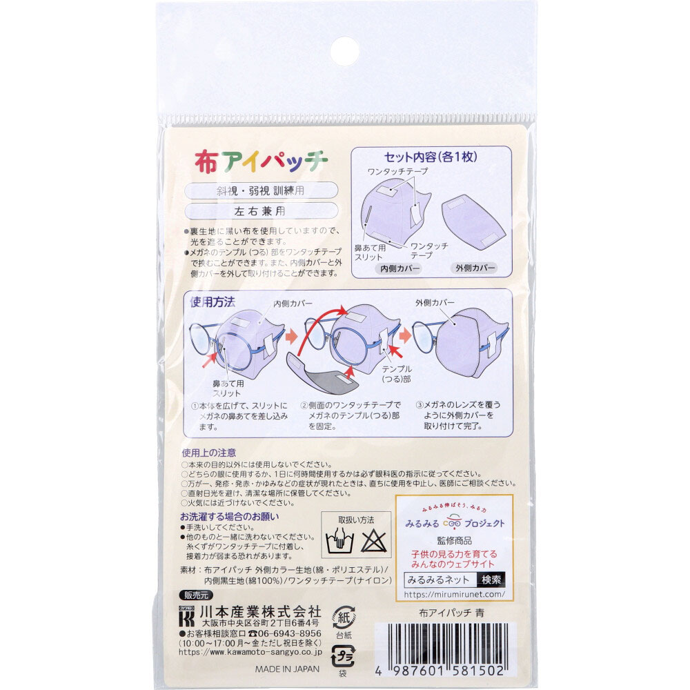 | 注意事項 | 【使用上の注意】 ・本来の目的以外には使用しないでください。 ・どちらの眼に使用するか、1日に何時間使用するかは必ず眼科医の指示に従ってください。 ・万が一、発疹・発赤・かゆみなどの症状が現れたときは、直ちに使用を中止し、医師にご相談ください。 ・直射日光を避け、清潔な場所に保管してください。 ・火気には近づけないでください。 【お洗濯する場合のお願い】 ・手洗いしてください。 ・他のものと一緒に洗わないでください。糸くずがワンタッチテープに付着し、接着力が弱まる恐れがあります。 |