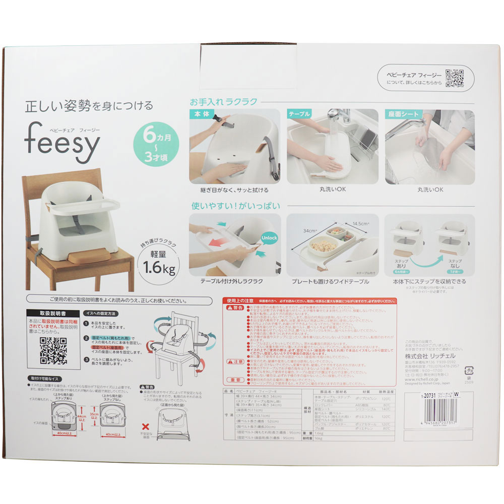| 素材 | 【寸法】 ・サイズ:39×44×34H(cm) ・ステップ・テーブル未使用時:39×35×34H(cm) ・テーブル内寸:34×14.5(cm) ・固定ベルト(背もたれ用)使用可能最長長さ:95(cm) ・固定ベルト(座面用)使用可能最長長さ:95(cm) ・製品重量/1.6kg 【耐荷重】 16kg 【対象月齢】 6カ月~3才頃。 【構造部材(耐熱温度)】 ・本体・テーブル・ステップ・テーブル固定穴:ポリプロピレン(120度) ・ロックレバー:ABS樹脂(80度) ・座面シート:シリコーンゴム(140度) ・股ベルト・腰ベルト・固定ベルト:ポリエステル(120度) ・バックル・アジャスター:ポリアセタール(120度) ・ゴム脚:ポリエチレン(80度) |