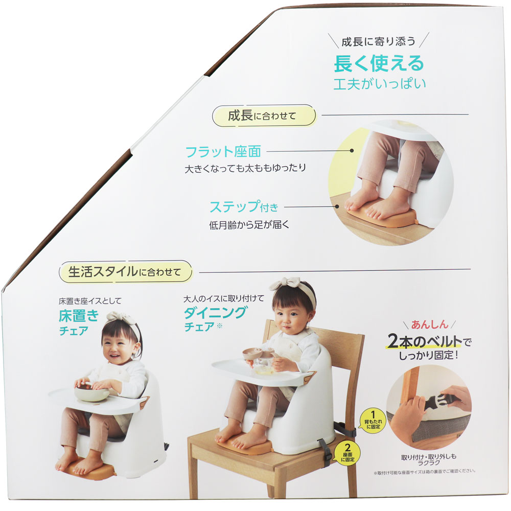 床置き座イスとして・ダイニングチェアとして。(大人のイスに2本のベルトでしっかり固定できます。)