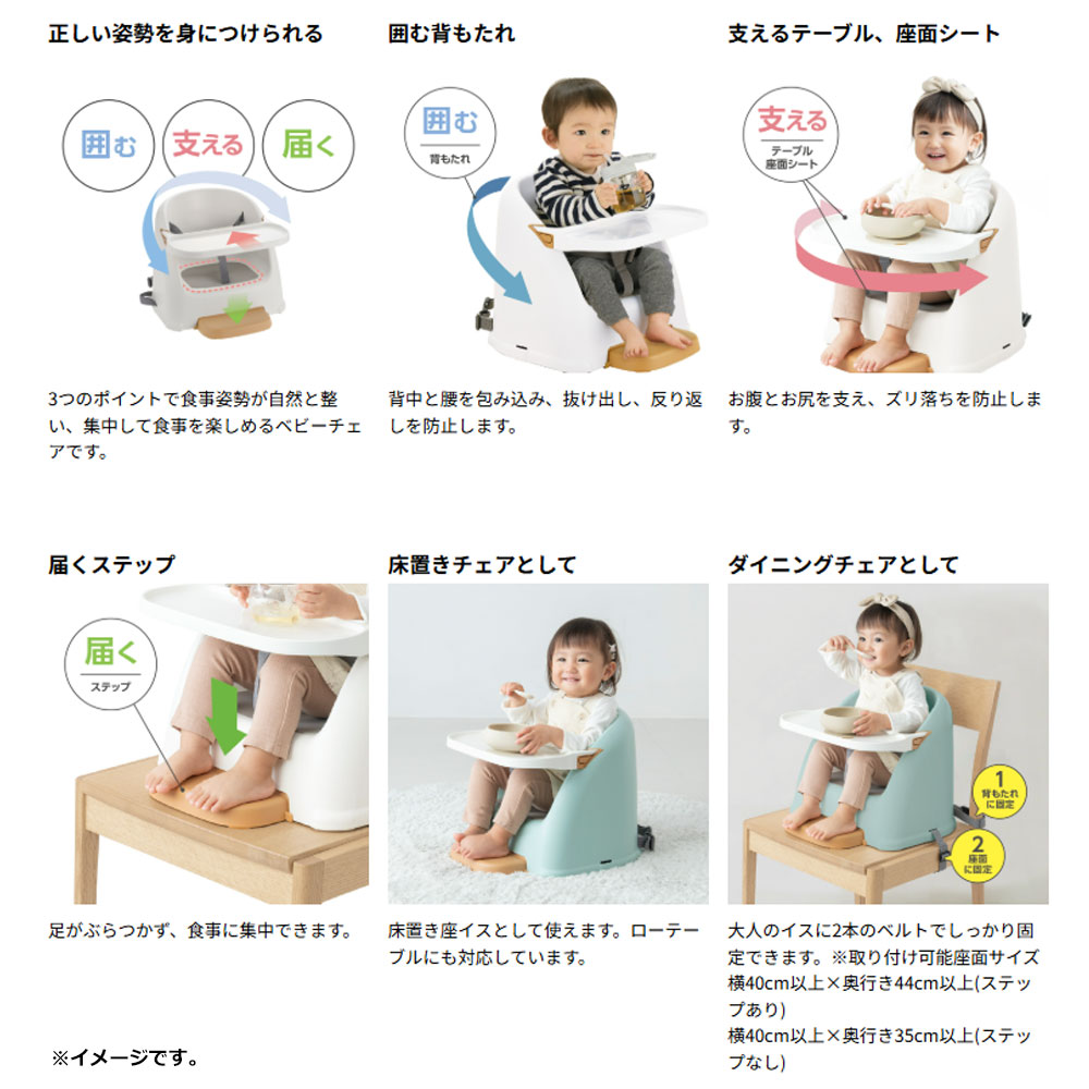 | 注意事項 | 【使用上の注意】 ・保護者の方へ 必ずお読みください。取扱いを誤ると重大な事故につながりますので、必ずお守りください。 ・お子様は思わぬ動作をしますので、必ず保護者の方が付き添ってください。 ・不安定な状態でお子様を座らせたり、お子様を乗せたまま持ち上げたり、移動しないでください。転落や転倒によるケガの原因となります。 ・本品の改造はしないでください。また、部品の代用品は使用しないでください。 ・本品は室内専用です。車内、浴室、屋外など用途以外には絶対に使用しないでください。 ・6カ月以上のお子様で、お座りができるようになってからご使用ください。 ・お子様を座らせているときは、股ベルト、腰ベルトを必ず装着してください。 ・お子様を座らせていないときは、腰ベルトのバックルを外し、股ベルトから抜いてください。お子様の首に巻きつくおそれがあります。 ・お子様が座面やステップに立ったり、身を乗り出したりしないよう注意してください。転倒のおそれがあります。 ・テーブルは正しくセットしてください。思わぬ事故の原因となります。 ・テーブルに体重をかけたり重いものを載せたりしないでください。転倒のおそれがあります。 ・イスの上でご使用の際は、必ず固定ベルト(座面用・背もたれ用)で本品とイスをしっかり固定してください。固定しないとケガや事故の原因となります。 ・床に置いて使用するときは固定ベルト(座面用)を取り外してください。 ・安全のため、破損や変形した場合は使用しないでください。 ・火気に近づけないでください。変質や変形、破損してケガをするおそれがあります。 ・本体の下やテーブルでお子様の指をはさまないよう注意してください。 ・テーブルを外して使用する場合、テーブル固定穴が露出するので注意してください。 ・使用しない場合は、必ずお子様の手の届かないところに保管してください。 ・直射日光の当たる場所に置かないでください。 ・フローリングの上で使用すると、キズが付く場合がありますので注意してください。 |