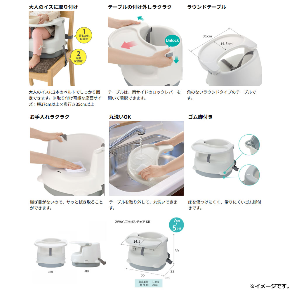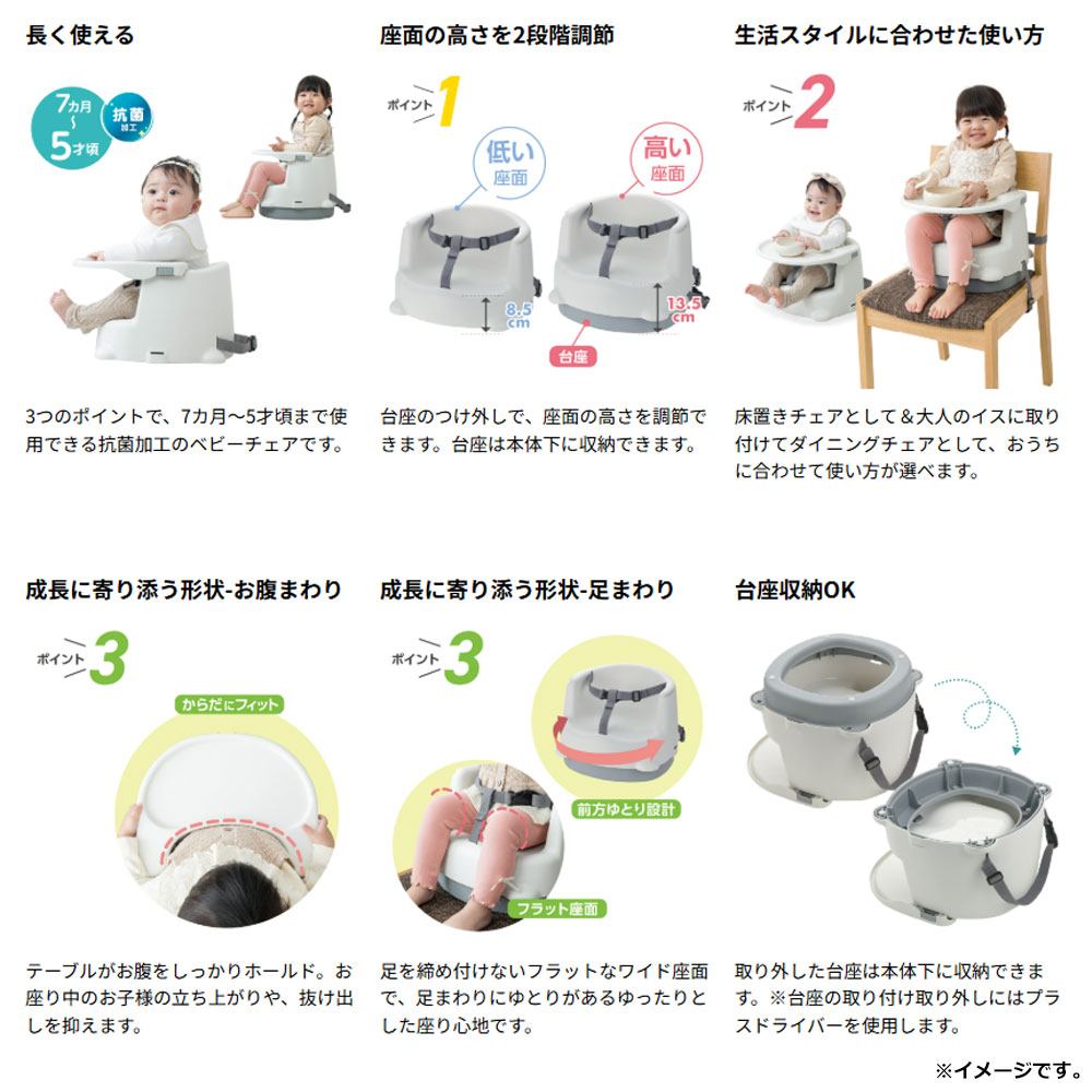 | 素材 | 【寸法】 ・サイズ:36×39×22H(cm) ・テーブル取り外し時:36×33×22H(cm) ・テーブル内寸:31×14.5(cm) ・固定ベルト(背もたれ用)使用可能最長長さ:90(cm) ・固定ベルト(座面用)使用可能最長長さ:95(cm) ・製品重量/1.3kg 【耐荷重】 20kg 【対象月齢】 7カ月~5才頃。 【構造部材(耐熱温度)】 ・本体・台座・テーブル:ポリプロピレン(120度) ・ロックレバー:ABS樹脂(80度) ・股ベルト・腰ベルト・固定ベルト:ポリエステル ・バックル・アジャスター:ポリアセタール ・ゴム脚:熱可塑性エラストマー(80度) |