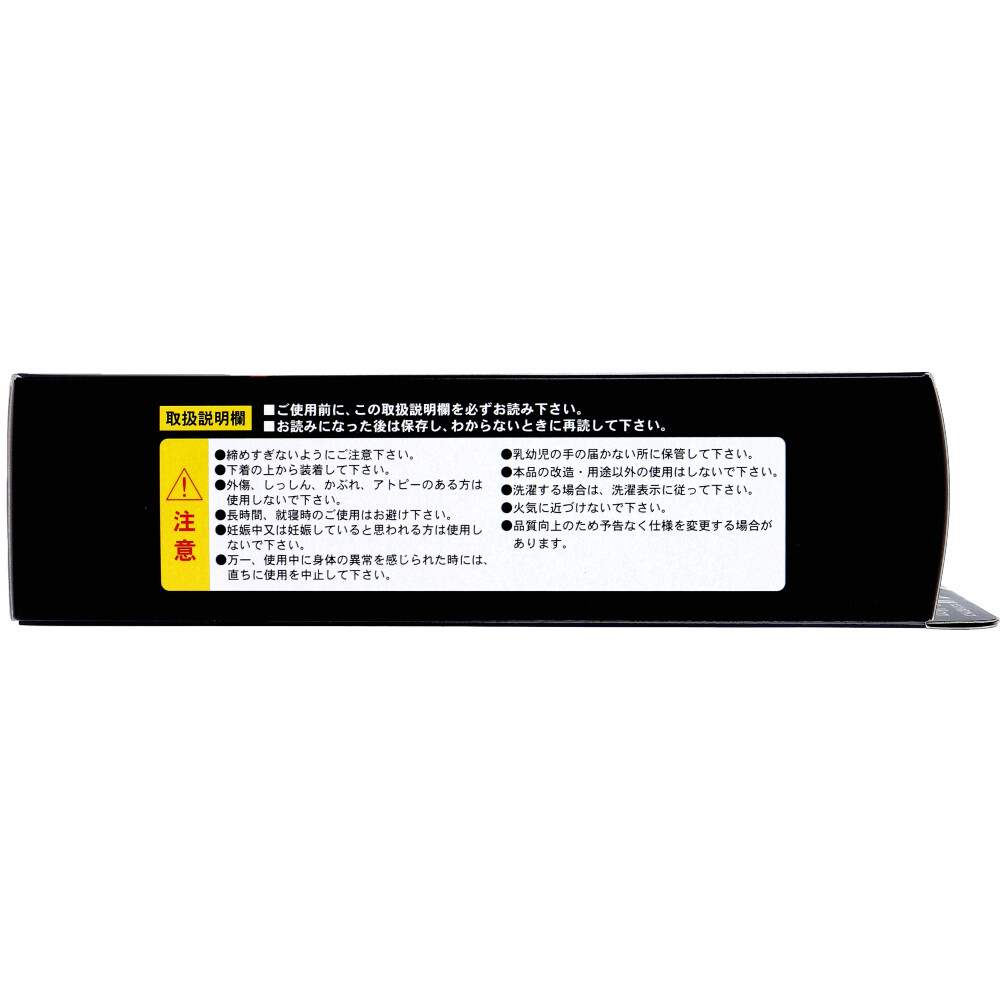 | 注意事項 | 【洗濯上のご注意】 色の異なるものとは分けて洗濯して下さい。 【注意】 ・締めすぎないようにご注意下さい。 ・下着の上から装着して下さい。 ・外傷、しっしん、かぶれ、アトピーのある方は使用しないで下さい。 ・長時間、就寝時のご使用はお避け下さい。 ・妊娠中又は妊娠していると思われる方は使用しないで下さい。 ・万一、使用中に身体の異常を感じられた時には、直ちに使用を中止して下さい。 ・乳幼児の手の届かない所に保管して下さい。 ・本品の改造、用途以外のご使用はしないで下さい。 ・洗濯する場合は、洗濯表示に従ってください。 ・火気に近づけないで下さい。 ・品質向上のために予告なく使用を変更する場合があります。 |