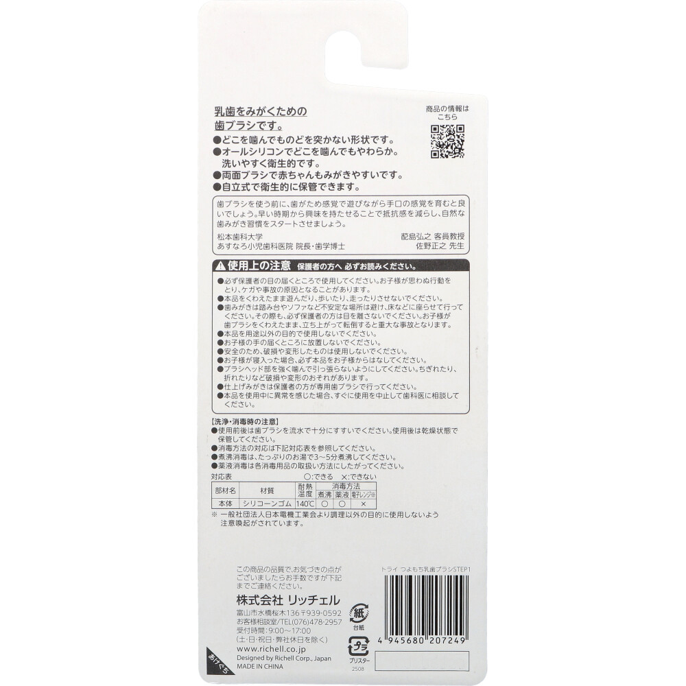 | 注意事項 | 【注意】 ・必ず保護者の目の届くところで使用してください。お子様が思わぬ行動をとり、ケガや事故の原因となることがあります。 ・本品をくわえたまま遊んだり、歩いたり、走ったりさせないでください。 ・歯みがきは踏み台やソファなど不安定な場所は避け、床などに座らせて行ってください。その際も、必ず保護者の方は目を離さないでください。お子様が歯ブラシをくわえたまま、立ち上がって転倒すると重大な事故となります。 ・本品を用途以外の目的で使用しないでください。 ・お子様の手の届くところに放置しないでください。 ・安全のため、破損や変形したものは使用しないでください。 ・お子様が寝入った場合、必ず本品をお子様からはなしてください。 ・ブラシヘッド部を強く噛んで引っ張らないようにしてください。ちぎれたり、折れたりなど破損や変形のおそれがあります。 ・仕上げみがきは保護者の方が専用歯ブラシで行ってください。 ・本品を使用中に異常を感じた場合、すぐに使用を中止して歯科医に相談してください。 ★洗浄・消毒時の注意 ・使用前後は歯ブラシを流水で十分にすすいでください。使用後は乾燥状態で保管してください。 ・消毒方法の対応は対応表を参照してください。 ・煮沸消毒は、たっぷりのお湯で3~5分煮沸してください。 ・薬液消毒は各消毒用品の取扱い方法にしたがってください。 |