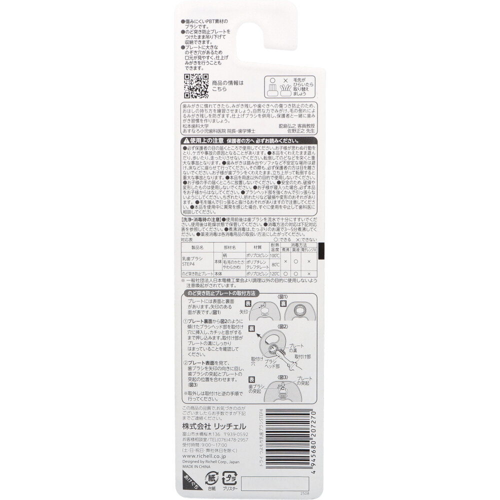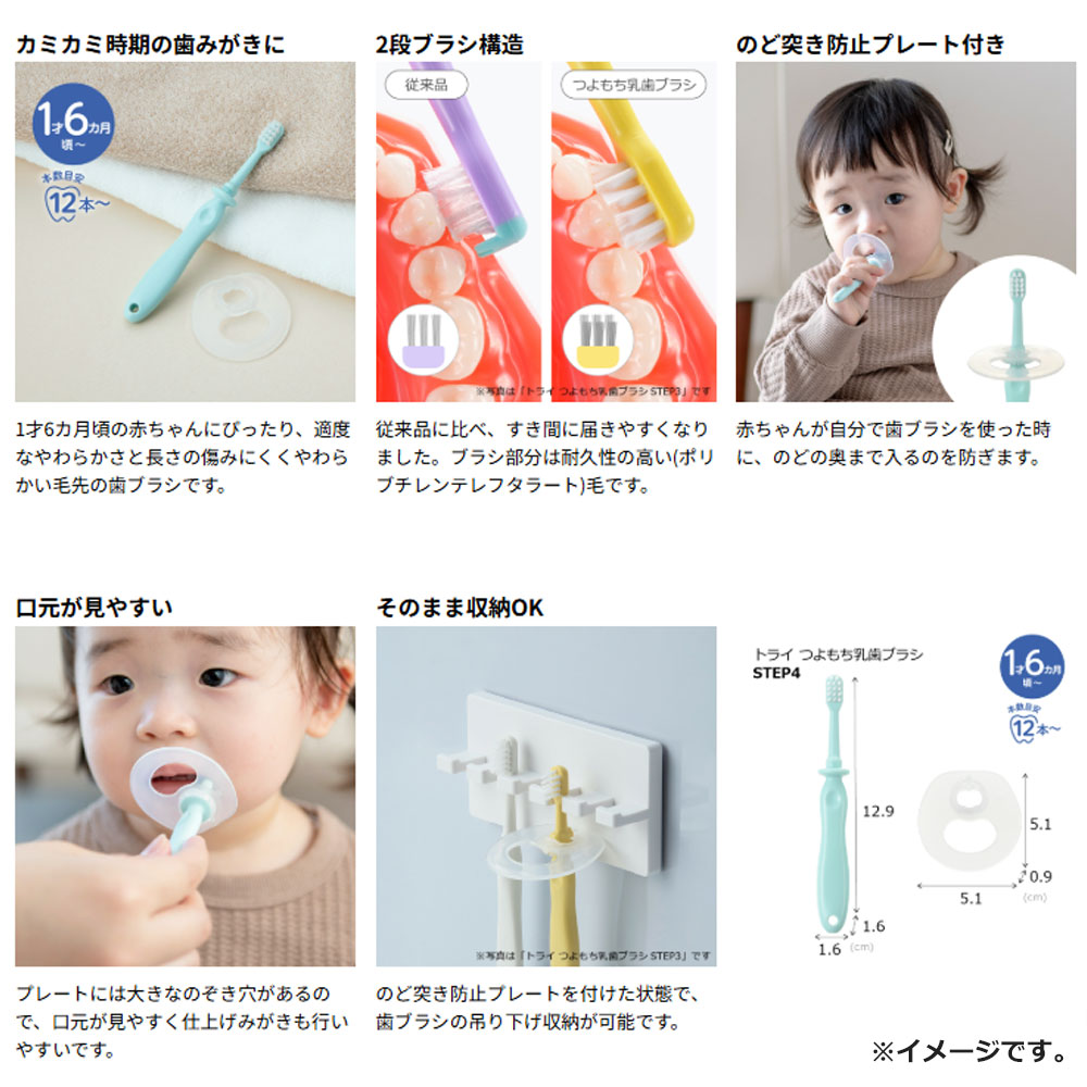 | 素材 | 【仕様】 ・乳歯ブラシSTEP4 (本体)柄:ポリプロピレン (本体)毛:ポリブチレンテレフタレート 耐熱温度 (本体)柄:100度 (本体)毛:80度 消毒方法:煮沸×、薬液〇、電子レンジ× ・のど突き防止プレート 本体:ポリプロピレン 耐熱温度:120度 消毒方法:煮沸〇、薬液〇、電子レンジ× |
