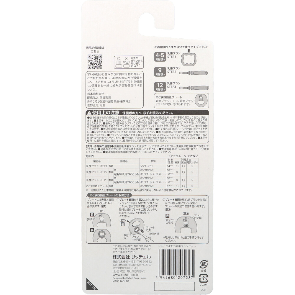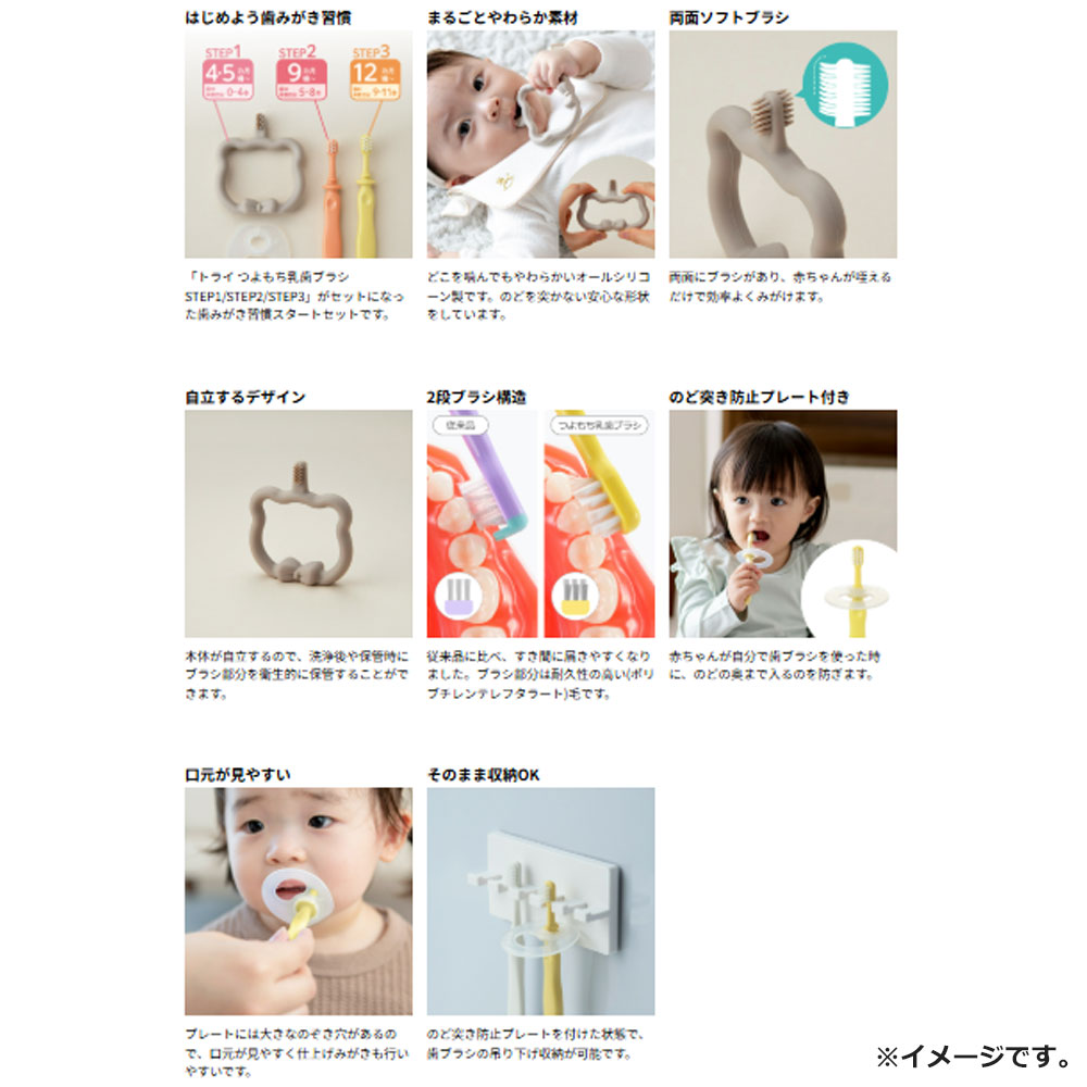 | 素材 | 【仕様】 ・乳歯ブラシSTEP1 材質:本体:シリコーンゴム 仕様:耐熱温度:140度 消毒方法:煮沸〇、薬液〇、電子レンジ× ・乳歯ブラシSTEP2 (本体)柄:ポリプロピレン (本体)毛:ポリブチレンテレフタレート 耐熱温度 (本体)柄:100度 (本体)毛:80度 消毒方法:煮沸×、薬液〇、電子レンジ× ・乳歯ブラシSTEP3 (本体)柄:ポリプロピレン (本体)毛:ポリブチレンテレフタレート 耐熱温度 (本体)柄:100度 (本体)毛:80度 消毒方法:煮沸×、薬液〇、電子レンジ× ・のど突き防止プレート 本体:ポリプロピレン 耐熱温度:120度 消毒方法:煮沸〇、薬液〇、電子レンジ× |