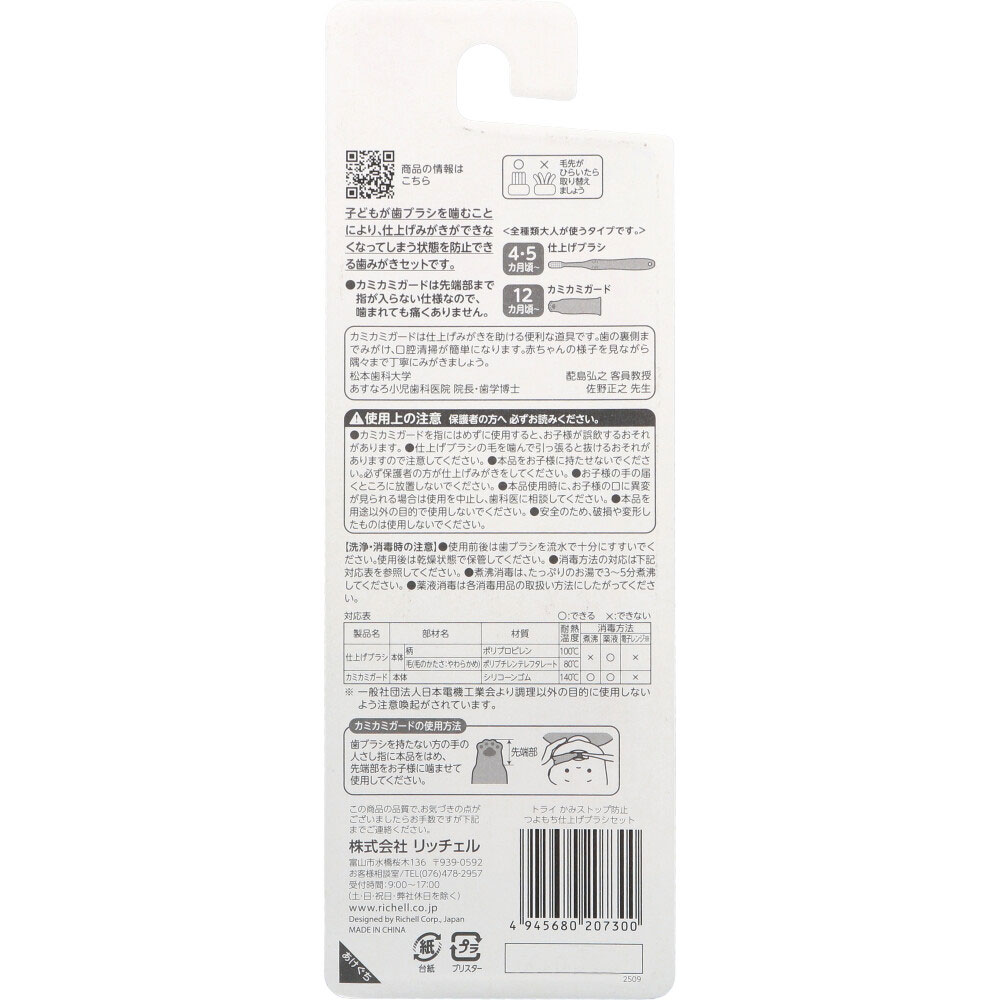 | 注意事項 | 【注意】 ・カミカミガードを指にはめずに使用すると、お子様が誤飲するおそれがあります。 ・仕上げブラシの毛を噛んで引っ張ると抜けるおそれがありますので注意してください。 ・本品をお子様に持たせないでください。必ず保護者の方が仕上げみがきをしてください。 ・お子様の手の届くところに放置しないでください。 ・本品使用時に、お子様の口に異変が見られる場合は使用を中止し、歯科医に相談してください。 ・本品を用途以外の目的で使用しないでください。 ・安全のため、破損や変形したものは使用しないでください。 ★洗浄・消毒時の注意 ・使用前後は歯ブラシを流水で十分にすすいでください。使用後は乾燥状態で保管してください。 ・消毒方法の対応は対応表を参照してください。 ・薬液消毒は各消毒用品の取扱い方法にしたがってください。 ・煮沸消毒は、たっぷりのお湯で3~5分煮沸してください。 ・薬液消毒は各消毒用品の取扱い方法にしたがってください。 |