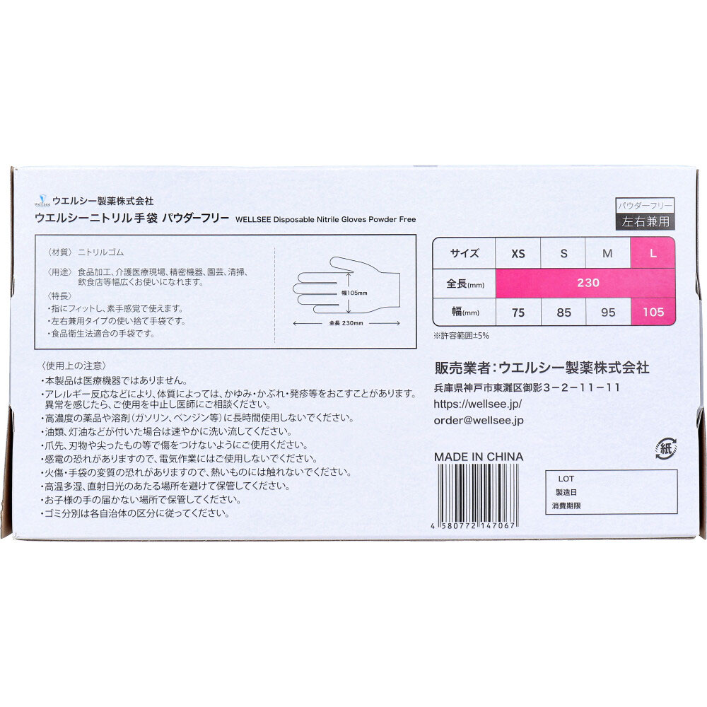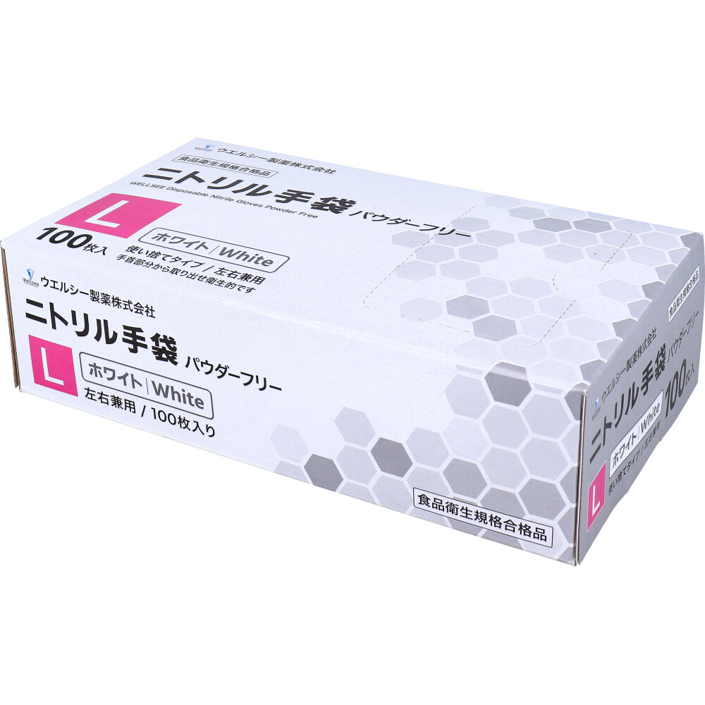 [メーカー欠品] 【業務用】ウエルシー ニトリル手袋 パウダーフリー 使い捨てタイプ 左右兼用 ホワイト L 100枚入