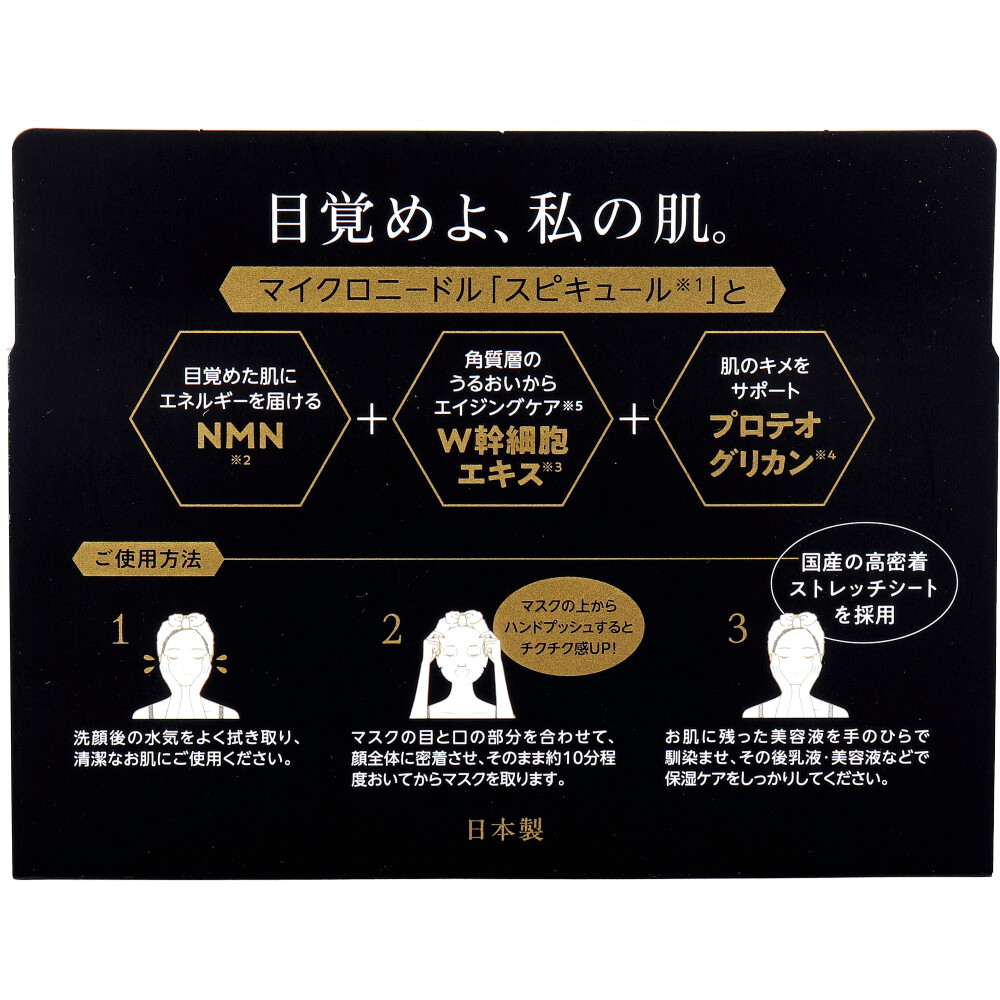 | 素材 | 【化粧品】 販売名:SPBシートマスク 【全成分】 水、グリセリン、イソペンチルジオール、加水分解カイメン、ニコチンアミドモノヌクレオチド、リンゴ果実培養細胞エキス、ヒト脂肪細胞順化培養液エキス、水溶性プロテオグリカン、カンゾウ根エキス、ツボクサエキス、チャ葉エキス、イタドリ根エキス、オウゴン根エキス、カミツレ花エキス、ローズマリー葉エキス、セラミドNG、セラミドNP、セラミドAP、ソルビトール、キサンタンガム、PEG-60水添ヒマシ油、オリーブ果実油、BG、水添レシチン、ケイ酸Ca、ケイ酸Na、フィトステロールズ、1,2-ヘキサンジオール、(クエン酸/乳酸/リノール酸/オレイン酸)グリセリル、ポリソルベート60、カプリリルグリコール、エチルヘキシルグリセリン、トロポロン、クエン酸、クエン酸Na、フェノキシエタノール、メチルパラベン 【ご使用方法】 (1)洗顔後の水気をよく拭き取り、清潔なお肌にご使用ください。 (2)マスクの目と口の部分を合わせて、顔全体に密着させ、そのまま約10分程度おいてからマスクを取ります。 マスクの上からハンドプッシュするとチクチク感UP! (3)お肌に残った美容液を手のひらで馴染ませ、その後乳液・美容液などで保湿ケアをしっかりしてください。 |