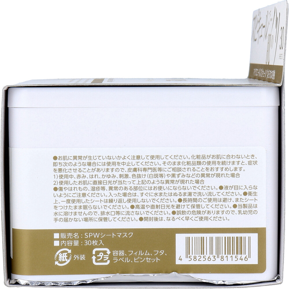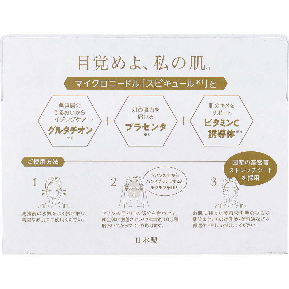 | 素材 | 【化粧品】 販売名:SPWシートマスク 【全成分】 水、グリセリン、イソペンチルジオール、加水分解カイメン、グルタチオン、プラセンタエキス、テトラヘキシルデカン酸アスコルビル、水添レチノール、水溶性プロテオグリカン、カンゾウ根エキス、ツボクサエキス、チャ葉エキス、イタドリ根エキス、オウゴン根エキス、カミツレ花エキス、ローズマリー葉エキス、セラミドNG、セラミドNP、セラミドAP、ソルビトール、キサンタンガム、PEG-60水添ヒマシ油、トリ(カプリル酸/カプリン酸)グリセリル、BG、水添レシチン、ケイ酸Ca、フィトステロールズ、ケイ酸Na、クエン酸、クエン酸Na、フェノキシエタノール、メチルパラベン 【ご使用方法】 (1)洗顔後の水気をよく拭き取り、清潔なお肌にご使用ください。 (2)マスクの目と口の部分を合わせて、顔全体に密着させ、そのまま約10分程度おいてからマスクを取ります。 マスクの上からハンドプッシュするとチクチク感UP! (3)お肌に残った美容液を手のひらで馴染ませ、その後乳液・美容液などで保湿ケアをしっかりしてください。 |