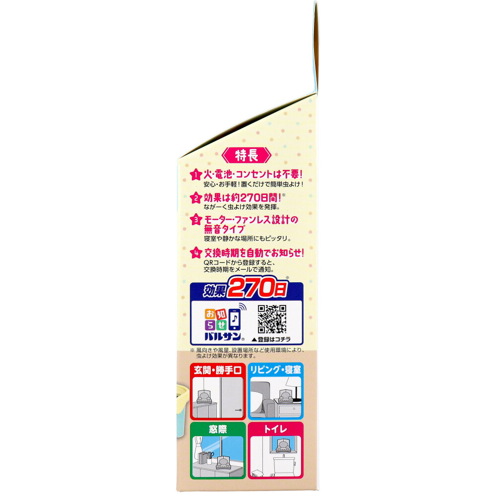 | 素材 | 【セット内容】 本体1個、アクリルスタンド1セット 【適用害虫】 ユスリカ 【使用の目安】 6畳までの広さの部屋に対し1個 【使用期間】 約270日(使用環境により異なります) 【有効成分】 トランスフルトリン(ピレスロイド系) 【材料表示】 本体:PET アクリルスタンド:アクリル樹脂 【使用方法】 (1)本体が入っている袋を開け、本体を取り出します。(薬剤の揮散が始まります。) バルサンロゴがある面に日付が記入できます。油性ペン等で開封した月/日を書き込んでください。 (2)アクリルスタンドの両面にある保護フィルムを剥がします。 (3)背景2枚を組み合わせます。 (4)本体にあいている穴にアクリルスタンドを差し込みます。 (5)イヤな虫が潜んでいそうな場所、または飛来しそうな場所に設置してください。 ・玄関・リビング・窓際・寝室・トイレなど。 ★効果を高めるポイント:空気の流れのある窓や出入り口付近に設置すると効果的です。 |
