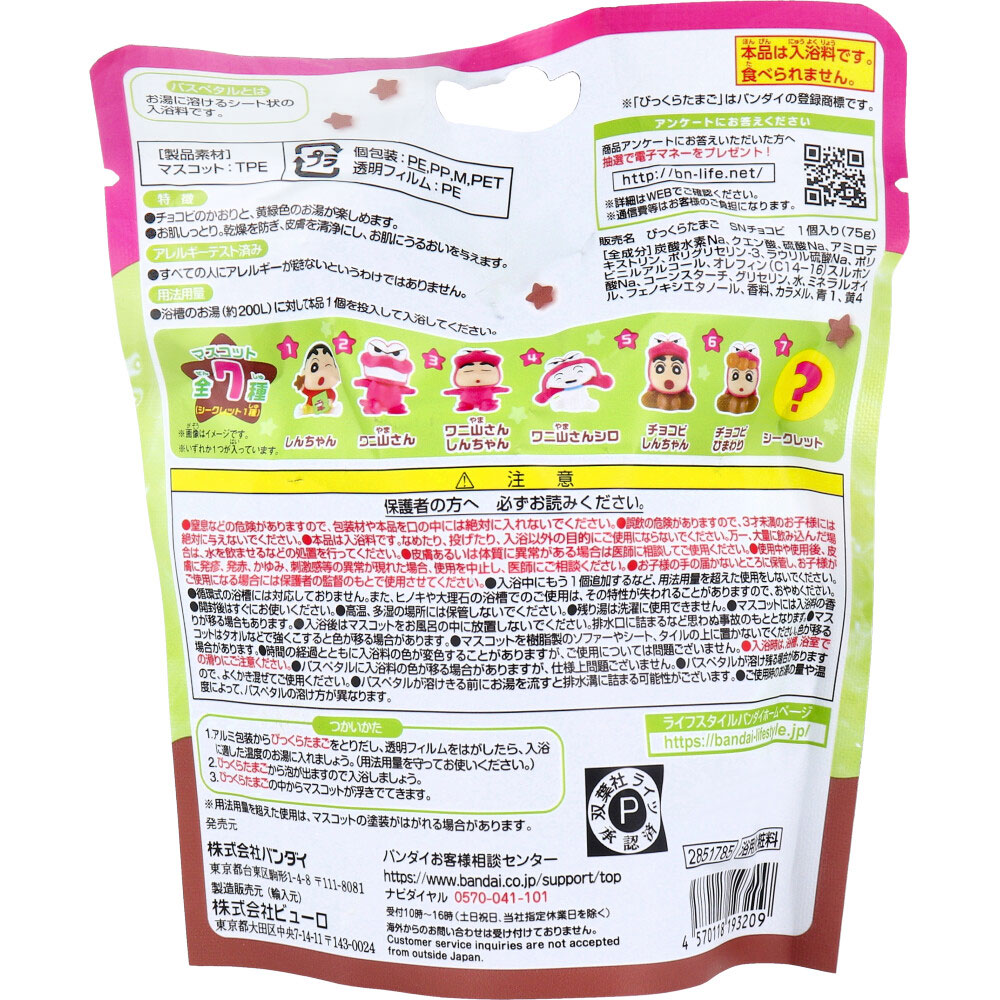 | 素材 | 【入浴用化粧品】 販売名:びっくらたまご SNチョコビ 【製品素材】 マスコット:TPE 【全成分】 炭酸水素Na、クエン酸、硫酸Na、アミロデキストリン、ポリグリセリン-3、ラウリル硫酸Na、ポリビニルアルコール、オレフィン(C14-16)スルホン酸Na、コーンスターチ、グリセリン、水、ミネラルオイル、フェノキシエタノール、香料、カラメル、青1、黄4 【用法用量】 ・浴槽のお湯(約200L)に対して本品1個を投入して入浴してください。 【つかいかた】 (1)アルミ包装からびっくらたまごをとりだし、透明フィルムをはがしたら、入浴に適した温度のお湯に入れましょう。(用法用量を守ってお使いください。) (2)びっくらたまごから泡が出ますので入浴しましょう。 (3)びっくらたまごの中からマスコットが浮きでてきます。 ※用法容量を超えた使用は、マスコットの塗料がはがれる場合があります。 |