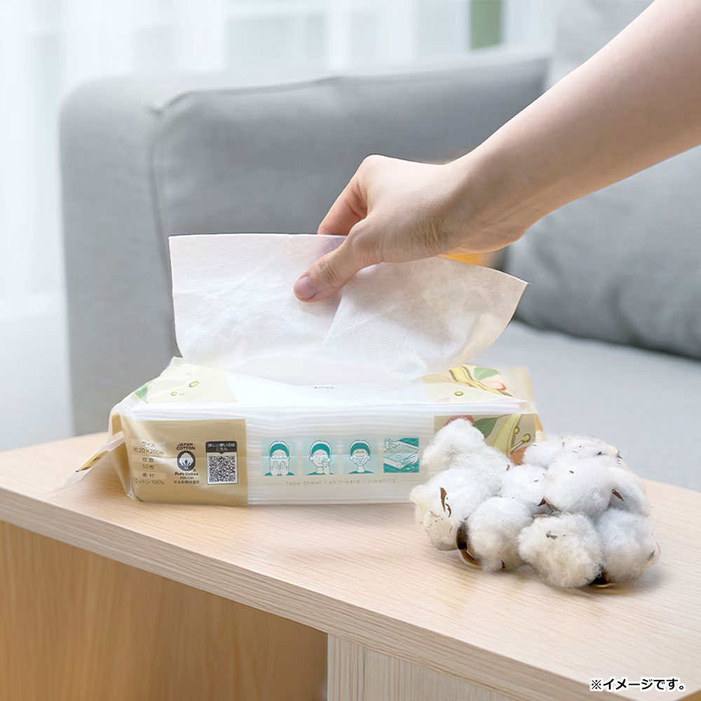 | 注意事項 | 【使用上の注意】 ・用途以外にはご使用にならないでください。 ・開封後はホコリやゴミが入らないように清潔に保管してください。 ・お肌に合わない場合は使用を中止し、医師にご相談ください。 ・乳幼児の手の届く場所、日の当たる場所、火気近く、および高温になる場所には置かないでください。 ・水に溶けませんので、トイレ等に流さないでください。 ・においの強い物のそばでの保管は避けてください。においが移ることがあります。 ・表面や内部に黒色や黄色の斑点状のものが見られることがありますが、これは綿花の果皮や種子の一部ですので安心してお使いください。 |