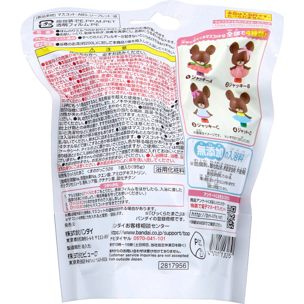 | 素材 | 【入浴用化粧品】 販売名:びっくらたまご くまのがっこう26 【製品素材】 マスコット:ABS リーフレット:紙 【全成分】 硫酸Na、炭酸水素Na、クエン酸、アミロデキストリン、ポリグリセリン-3、香料、シア脂、クチナシ黄、酸化チタン 【用法用量】 ・浴槽のお湯(約200L)に対して本商品1個を投入して入浴してください。 【つかいかた】 (1)アルミ包装からびっくらたまごをとりだし、透明フィルムをはがしたら、入浴に適した温度のお湯に入れましょう。(用法用量を守ってお使いください。) (2)びっくらたまごから泡が出ますので入浴しましょう。 (3)びっくらたまごの中からマスコットが浮きでてきます。 ※用法容量を超えた使用は、マスコットの塗料がはがれる場合があります。 ※マスコットは無理に力を入れると変形・破損します。 |