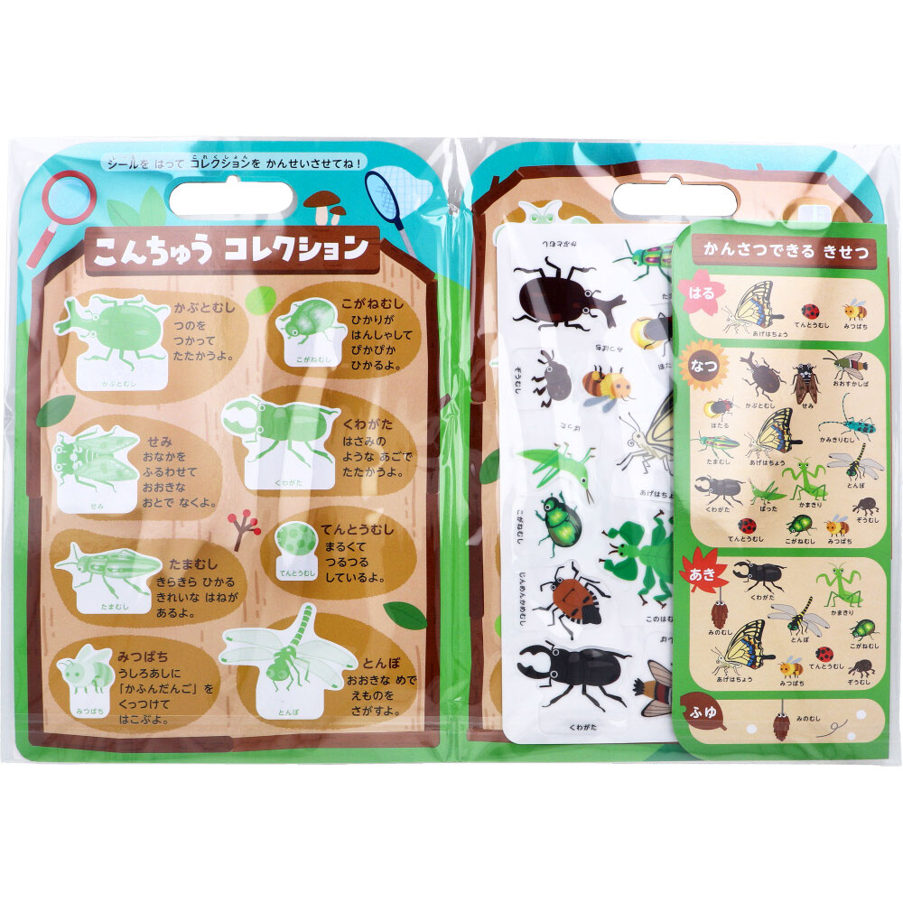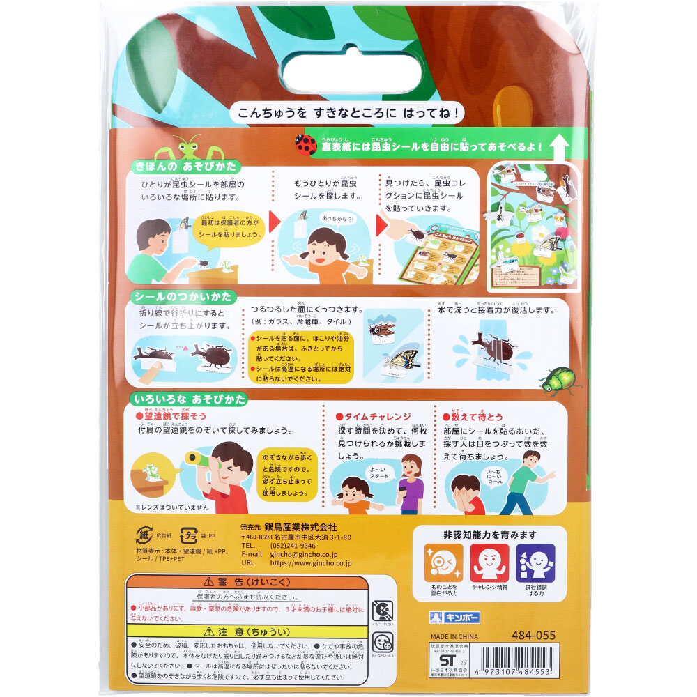 | 素材 | 【材質表示】 本体・望遠鏡:紙+PP シール:TPE+PET 【対象年令】 3才以上 【きほんのあそびかた】 ・ひとりが昆虫シールを部屋のいろいろな場所に貼ります。最初は保護者の方がシールを貼りましょう。 ・もうひとりが昆虫シールを探します。 ・見つけたら、昆虫シールコレクションに昆虫シールを貼っていきます。 【シールのつかいかた】 ・折り線で谷折りにするとシールが立ち上がります。 ・つるつるした面にくっつきます。(例:ガラス、冷蔵庫、タイル) ・シールを貼る面に、ほこりや油分がある場合は、ふきとってから貼ってください。 ・シールは高温になる場所には絶対に貼らないでください。 ・水で洗うと接着力が復活します。 【いろいろなあそびかた】 ・望遠鏡で探そう。 付属の望遠鏡でのぞいて探してみましょう。※レンズはついていません。 のぞきながら歩くと危険ですので、必ず立ち止まって使用しましょう。 ・タイムチャレンジ。 探す時間を決めて、何枚見つけられるか挑戦しましょう。 ・数えて待とう。 部屋にシールを貼るあいだ、探す人は目をつぶって数を数えて待ちましょう。 |