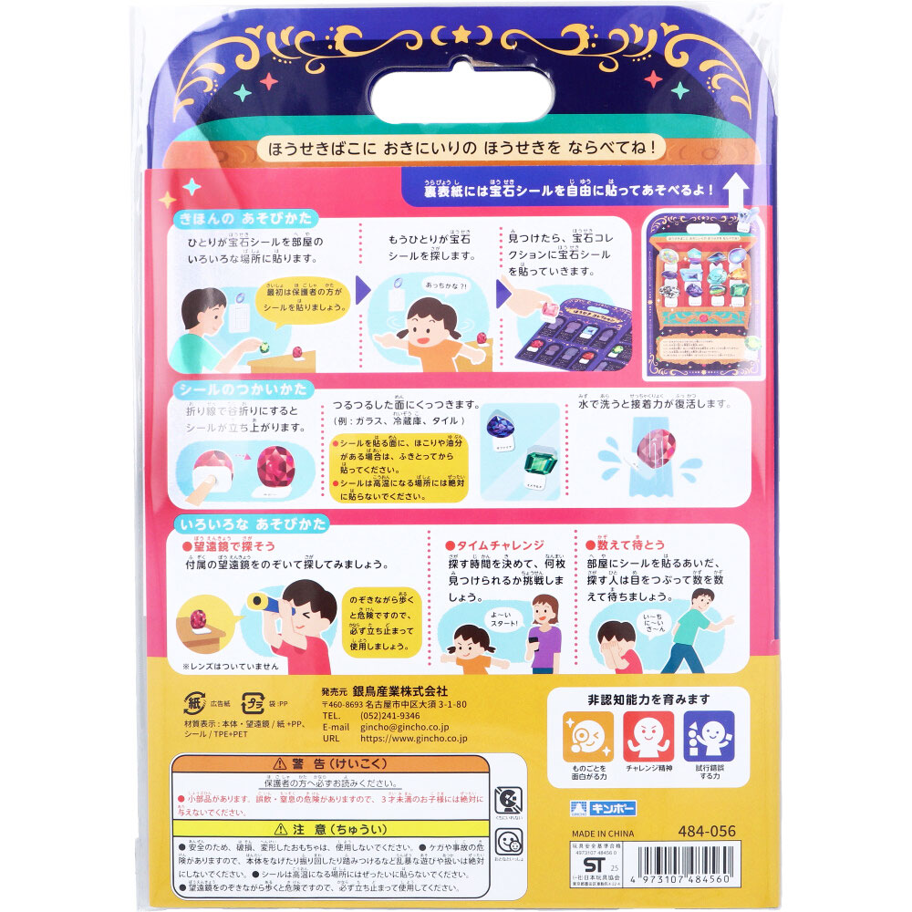 | 素材 | 【材質表示】 本体・望遠鏡:紙+PP シール:TPE+PET 【対象年令】 3才以上 【きほんのあそびかた】 ・ひとりが宝石シールを部屋のいろいろな場所に貼ります。最初は保護者の方がシールを貼りましょう。 ・もうひとりが宝石シールを探します。 ・見つけたら、宝石シールコレクションに宝石シールを貼っていきます。 【シールのつかいかた】 ・折り線で谷折りにするとシールが立ち上がります。 ・つるつるした面にくっつきます。(例:ガラス、冷蔵庫、タイル) ・シールを貼る面に、ほこりや油分がある場合は、ふきとってから貼ってください。 ・シールは高温になる場所には絶対に貼らないでください。 ・水で洗うと接着力が復活します。 【いろいろなあそびかた】 ・望遠鏡で探そう。 付属の望遠鏡でのぞいて探してみましょう。※レンズはついていません。 のぞきながら歩くと危険ですので、必ず立ち止まって使用しましょう。 ・タイムチャレンジ。 探す時間を決めて、何枚見つけられるか挑戦しましょう。 ・数えて待とう。 部屋にシールを貼るあいだ、探す人は目をつぶって数を数えて待ちましょう。 |