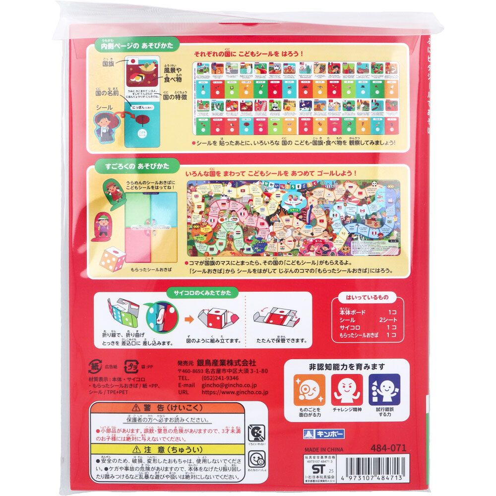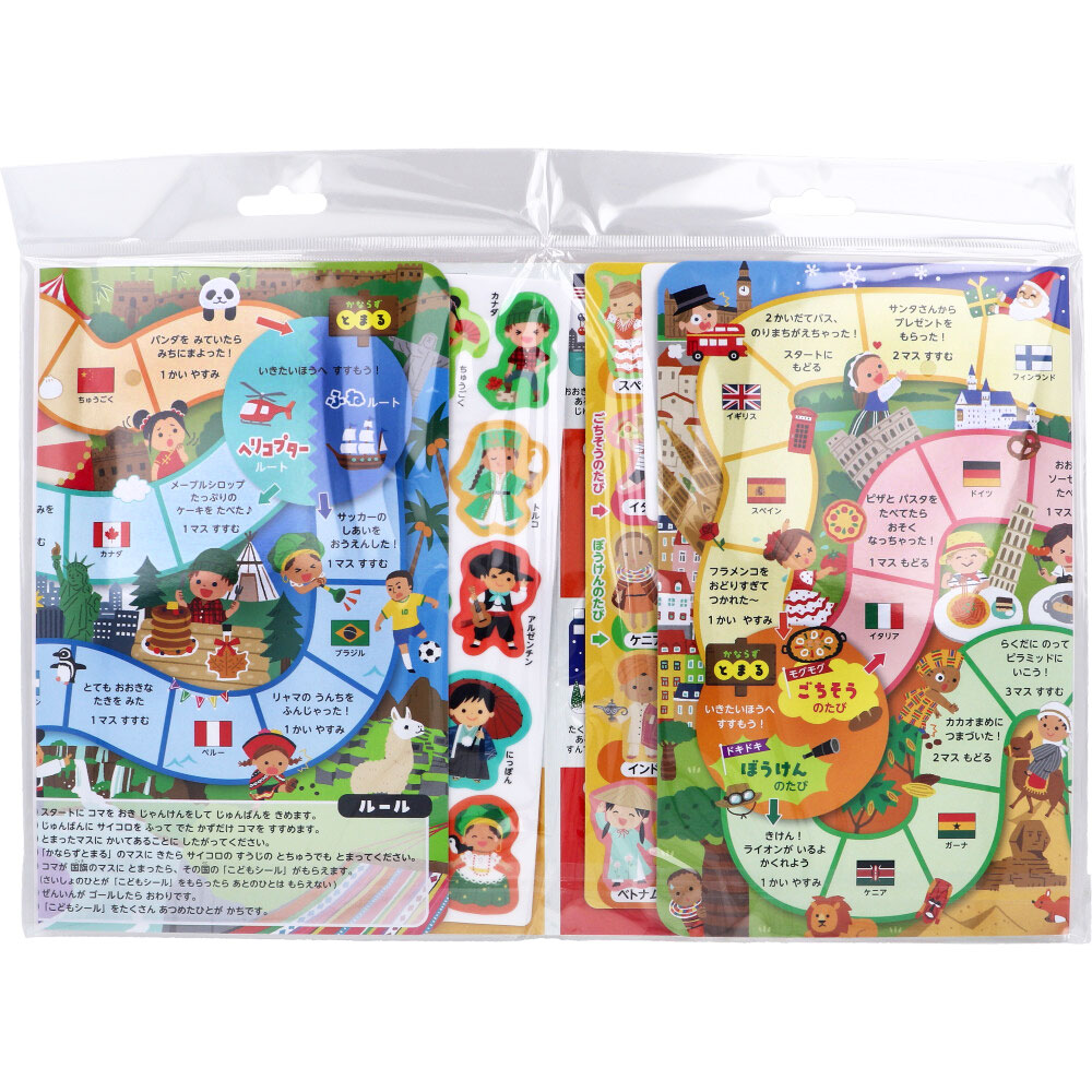 | 素材 | 【材質表示】 本体・サイコロ・もらったシールおきば:紙+PP シール:TPE+PET 【はいっているもの】 本体ボード 1コ シール 2シート サイコロ 1コ もらったシールおきば 1コ 【対象年令】 3才以上 【内側ページのあそびかた】 それぞれの国にこどもシールをはろう! シールを貼ったあとに、いろいろな国のこども・国旗・食べ物を観察してみましょう! 【すごろくのあそびかた】 いろいろな国をまわってこどもシールをあつめてゴールしよう! 【サイコロのくみたてかた】 折り線で、折り曲げ、とっきを差込口に差し込みます。 たたんで保管できます。 |