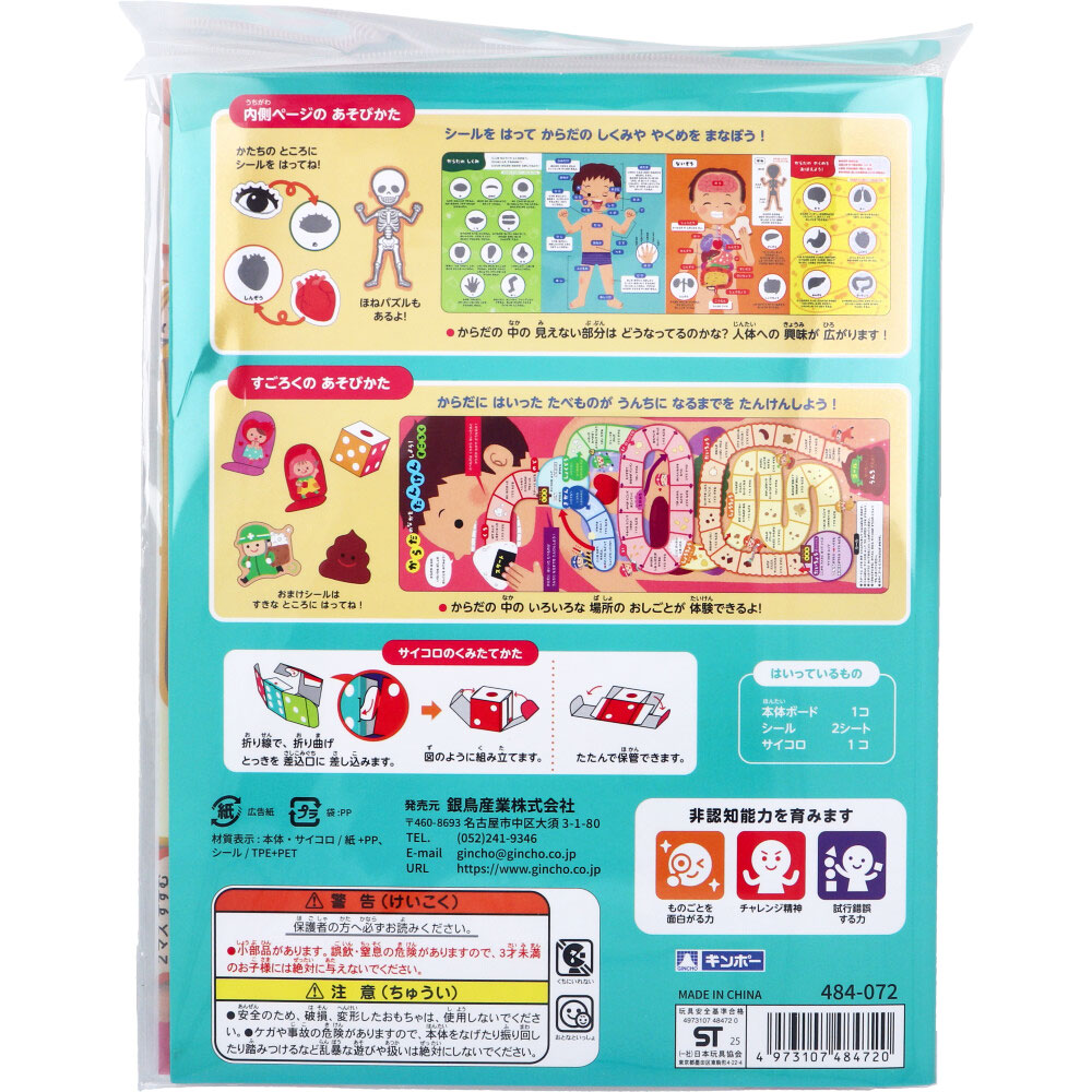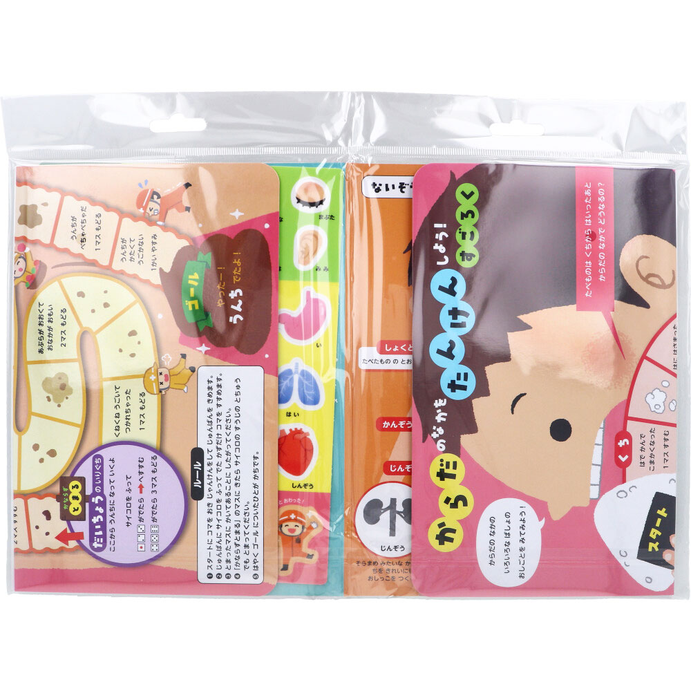 | 素材 | 【材質表示】 本体・サイコロ:紙+PP シール:TPE+PET 【はいっているもの】 本体ボード 1コ シール 2シート サイコロ 1コ 【対象年令】 3才以上 【内側ページのあそびかた】 シールをはってからだのしくみややくめをまなぼう! からだの中の見えない部分はどうなっているのかな?人体への興味が広がります! 【すごろくのあそびかた】 からだにはいったたべものがうんちになるまでをたんけんしよう! 【サイコロのくみたてかた】 折り線で、折り曲げ、とっきを差込口に差し込みます。 たたんで保管できます。 |