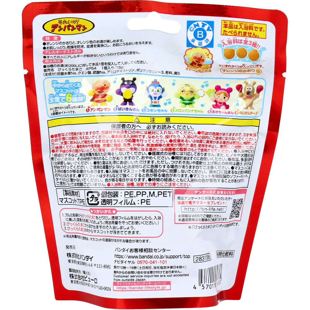 | 素材 | 【浴用化粧料】 販売名:びっくらたまごAP54 【製品素材】 マスコット:TPE 【全成分】 炭酸水素Na、クエン酸、硫酸Na、アミロデキストリン、ポリグリセリン-3、香料、黄5 【用法用量】 ・浴槽のお湯(約200L)に対して本商品1個を投入して入浴してください。 【つかいかた】 (1)アルミ包装からびっくらたまごをとりだし、透明フィルムをはがしたら、入浴に適した温度のお湯に入れましょう。(用法用量を守ってお使いください。) (2)びっくらたまごから泡が出ますので入浴しましょう。 (3)びっくらたまごの中からマスコットが浮きでてきます。 ※用法用量を超えた使用は、マスコットの塗料がはがれる場合があります。 |