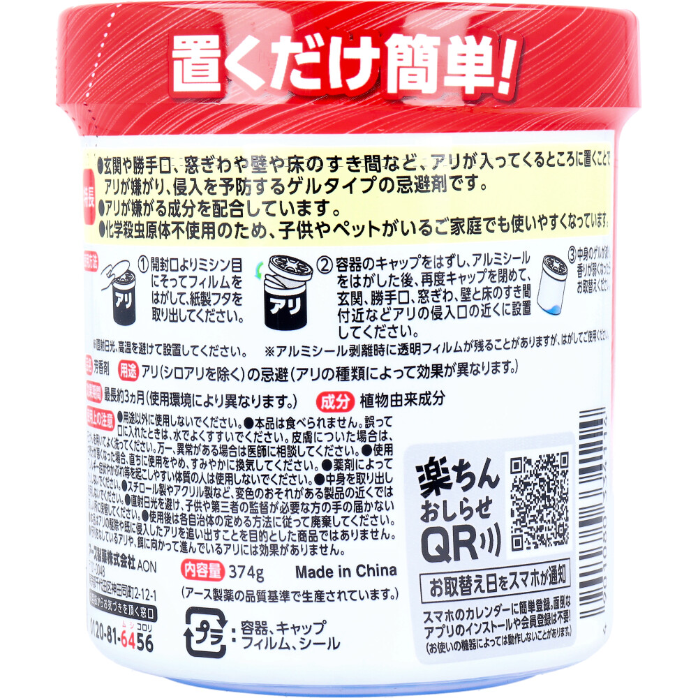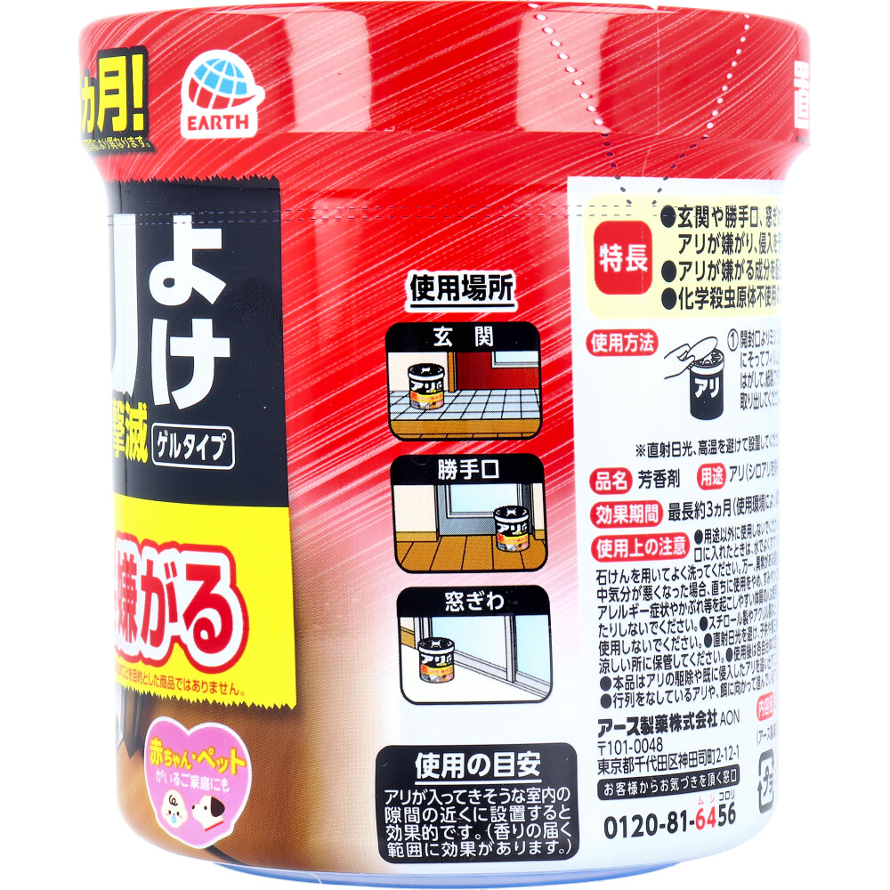 | 素材 | 【品名】 芳香剤 【成分】 植物由来成分 【用途】 アリ(シロアリを除く)の忌避(アリの種類によって効果が異なります。) 【効果期間】 最長約3カ月(使用環境により異なります。) 【使用方法】 (1)開封口よりミシン目にそってフィルムをはがして、紙製フタを取り出してください。 (2)容器のキャップをはずし、アルミシールをはがした後、再度キャップを閉めて、玄関、勝手口、窓ぎわ、壁と床のすき間付近などアリの侵入口の近くに設置してください。 (3)中身のゲルが減り、香りが弱くなったらお取替えください。 ※直射日光、高温を避けて設置してください。 ※アルミシール剥離時に透明フィルムが残ることがありますが、はがしてご使用ください。 【使用場所】 玄関、勝手口、窓ぎわ 【使用の目安】 アリが入ってきそうな室内の隙間の近くに設置すると効果的です。 (香りの届く範囲に効果があります。) |