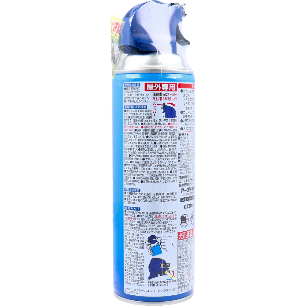| 注意事項 | 【使用に際しての注意】 ・使用前に必ず製品表示を読み、十分理解した上で使用する。 ・定められた用法・用量を厳守する。間違った使い方をすると、効力不足や健康を害することがある。 ・用途以外に使用しない。 ・本品は屋内で使用しない。 ・枯れるおそれがあるので植物には噴射しない。 ・皮膚、飲食物・食器・子供のおもちゃ・観賞魚・小鳥などのペット類・飼料・観賞植物・室外機、換気口にかからないようにする。 ・アレルギー症状やかふれを起こしやすい人、喘息の症状のある人、病人、妊婦、乳幼児等がいる場所では使用しない。 ・人体に向かって噴射しない。また噴射気体を吸入しない。 ・噴射中は喫煙、飲食等はしない。 ・薬剤が皮膚についた場合は、石けんを用いてよく洗う。また、目に入った場合は、直ちに水でよく洗い流す。 ・万一、身体に異常が起きた場合は、本品を持参し医師の診療を受ける。 ・スプレーしたものを火気に近づけない。 ・照明器具に薬液がかからないようにする。 ・外壁、大理石、御影石等の石材や自動車などの塗装面には変色のおそれがあるので、かからないようにする。 ・香り成分を含むため、周辺環境に配慮する。 ・衣服等に付着すると臭い残り、シミや変色のおそれがあるため注意する。 ・効果の持続時間は天候、季節、環境、使用場所により異なる。 ・薬剤が水槽、池、川などに入らないよう注意する。 【保管上の注意】 ・直射日光や火気をさけ、子供や第三者の監督が必要な方の手の届かない涼しい所に保管する。 ・缶のさびを防ぐため、水回りや湿気の多い場所には置かない。 ※屋外専用 ★火気と高温に注意。 |