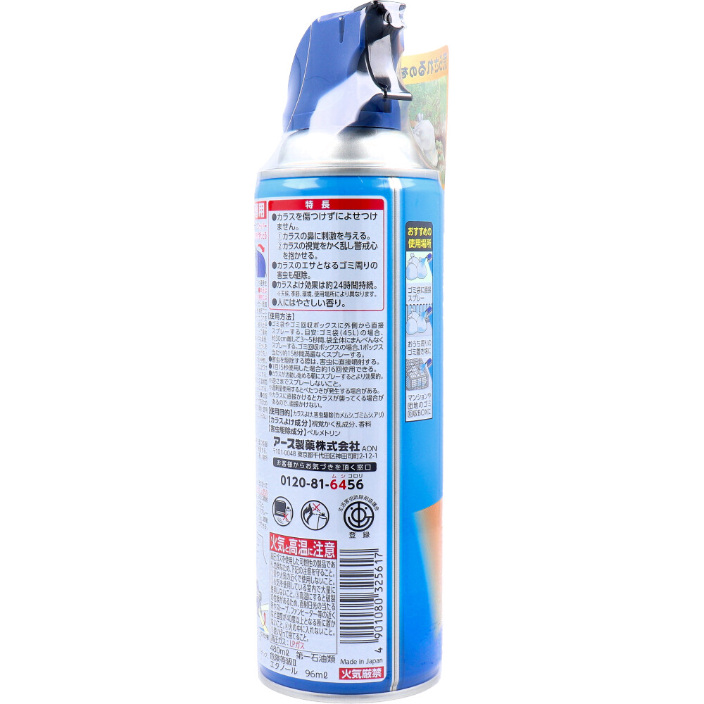 | 素材 | 【使用目的】 カラスよけ、害虫駆除(カメムシ、ゴミムシ、アリ) 【カラスよけ成分】 視覚かく乱成分、香料 【害虫駆除成分】 ペルメトリン 【使用方法】 使用開始時に天面のストッパーを上に持ち上げパキッと音がするまで後ろの方へ曲げて折りとる。 ・ゴミ袋やゴミ回収ボックスに外側から直接スプレーする。 目安:ゴミ袋(45L)の場合、約30cm離して3~5秒間、袋全体にまんべんなくスプレーする。ゴミ回収ボックスの場合、1ボックス当たり約15秒間満遍なくスプレーする。 【廃棄の方法】 ・本品は使い切ってから各自治体の定める方法に従って廃棄すること。 ・捨てるときは、風通しが良く、火気のない屋外で風下に向かって人にかからないように噴射レバーを引き、噴射音が消えるまでガスを抜くこと。 ・ガスの抜き方 噴射レバーを引いたまま、スプレーキャップ側面の孔につまようじ等を差し込むと、噴射レバーがロックされ最後までガスを抜くことができる。 その際、顔にかからないように注意すること。噴射が不十分な場合は、つまようじ等を押し下げると最後まで噴射する。 ・キャップの外し方 キャップ背面下部にある右の穴に割りばし等の棒を奥までしっかり差し込み、起こすように持ち上げて外す。 ・大量に使い残した缶の廃棄方法はアース製薬株式会社の窓口にお問い合わせください。 |