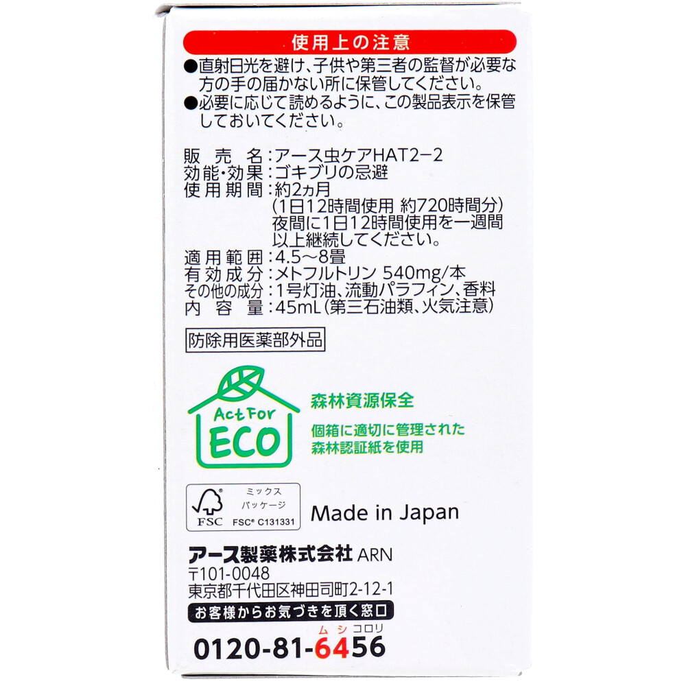 | 素材 | 【防除用医薬部外品】 販売名:アース虫ケアHAT2-2 【効能・効果】 ゴキブリの忌避 【使用期間】 約2ヵ月(1日12時間使用・約720時間分) 夜間に1日12時間使用を一週間以上継続してください。 【適用範囲】 4.5~8畳 【成分】 ★有効成分:メトフルトリン 540mg/本 ★その他の成分:1号灯油、流動パラフィン、香料 【内容量】 45mL(第三石油類、火気注意) 【取替え方法】 ・ボトルを必ず下にしてまっすぐ下方に引っぱってください。はずしにくいときは、スイッチを入れて30分ほど器具を温めてからはずしてください。 |