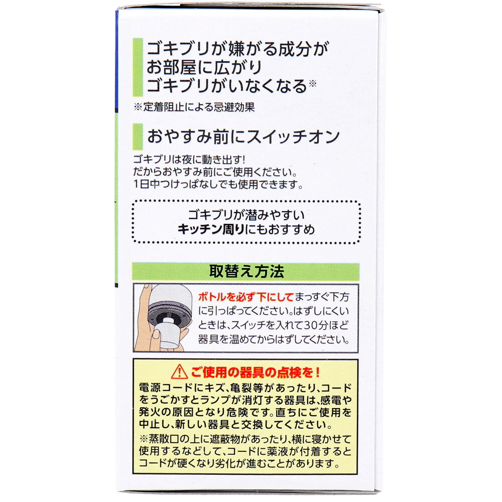 | 注意事項 | 【使用上の注意】 ・直射日光を避け、子供や第三者の監督が必要な方の手の届かない所に保管してください。 ・必要に応じて読めるように、この製品表示を保管しておいてください。 ★ご使用の器具の点検を! ・電源コードにキズ、亀裂等があったり、コードをうごかすとランプが点滅する器具は、感電や発火の原因となり危険です。直ちにご使用を中止し、新しい器具と交換してください。 ※蒸散口の上に遮蔽物があったり、横に寝かせて使用するなどして、コードに薬液が付着するとコードが硬くなり劣化が進むことがあります。 |