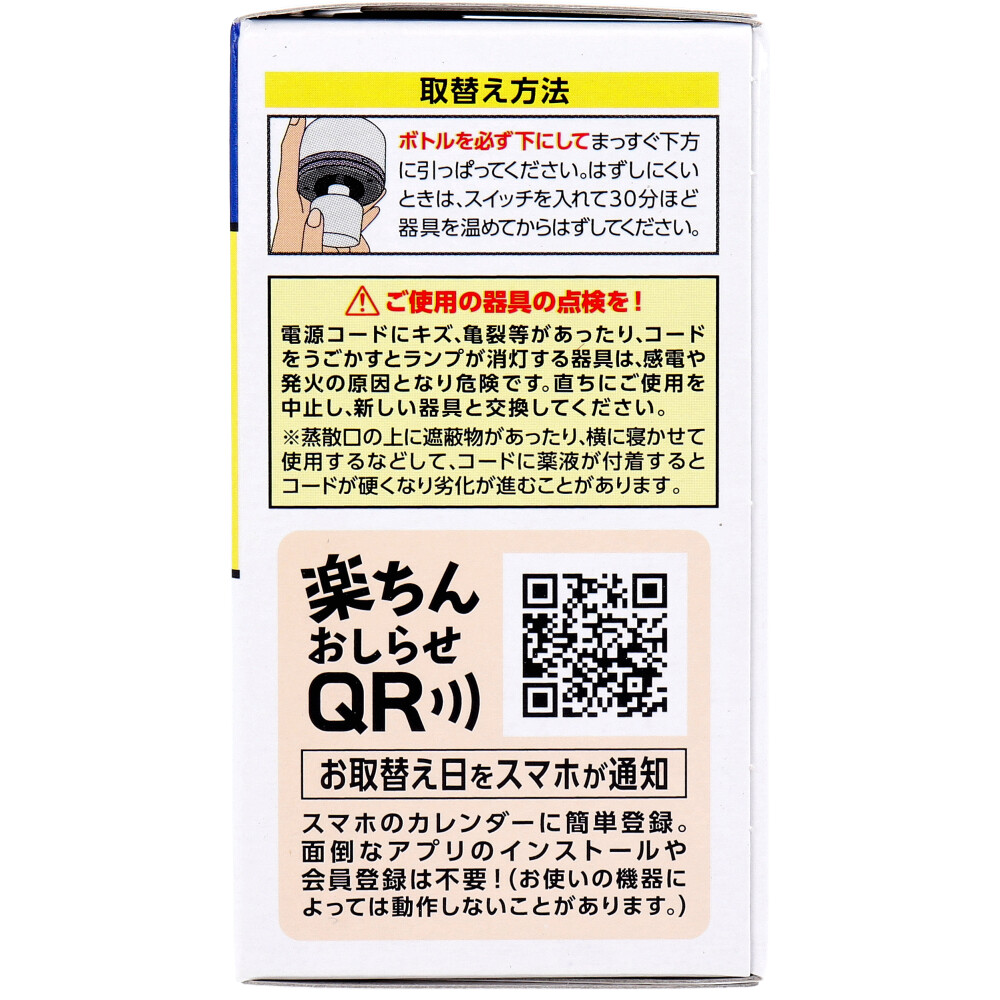 | 注意事項 | 【使用上の注意】 ・直射日光を避け、子供や第三者の監督が必要な方の手の届かない所に保管してください。 ・必要に応じて読めるように、この製品表示を保管しておいてください。 ★ご使用の器具の点検を! ・電源コードにキズ、亀裂等があったり、コードをうごかすとランプが点滅する器具は、感電や発火の原因となり危険です。直ちにご使用を中止し、新しい器具と交換してください。 ※蒸散口の上に遮蔽物があったり、横に寝かせて使用するなどして、コードに薬液が付着するとコードが硬くなり劣化が進むことがあります。 |