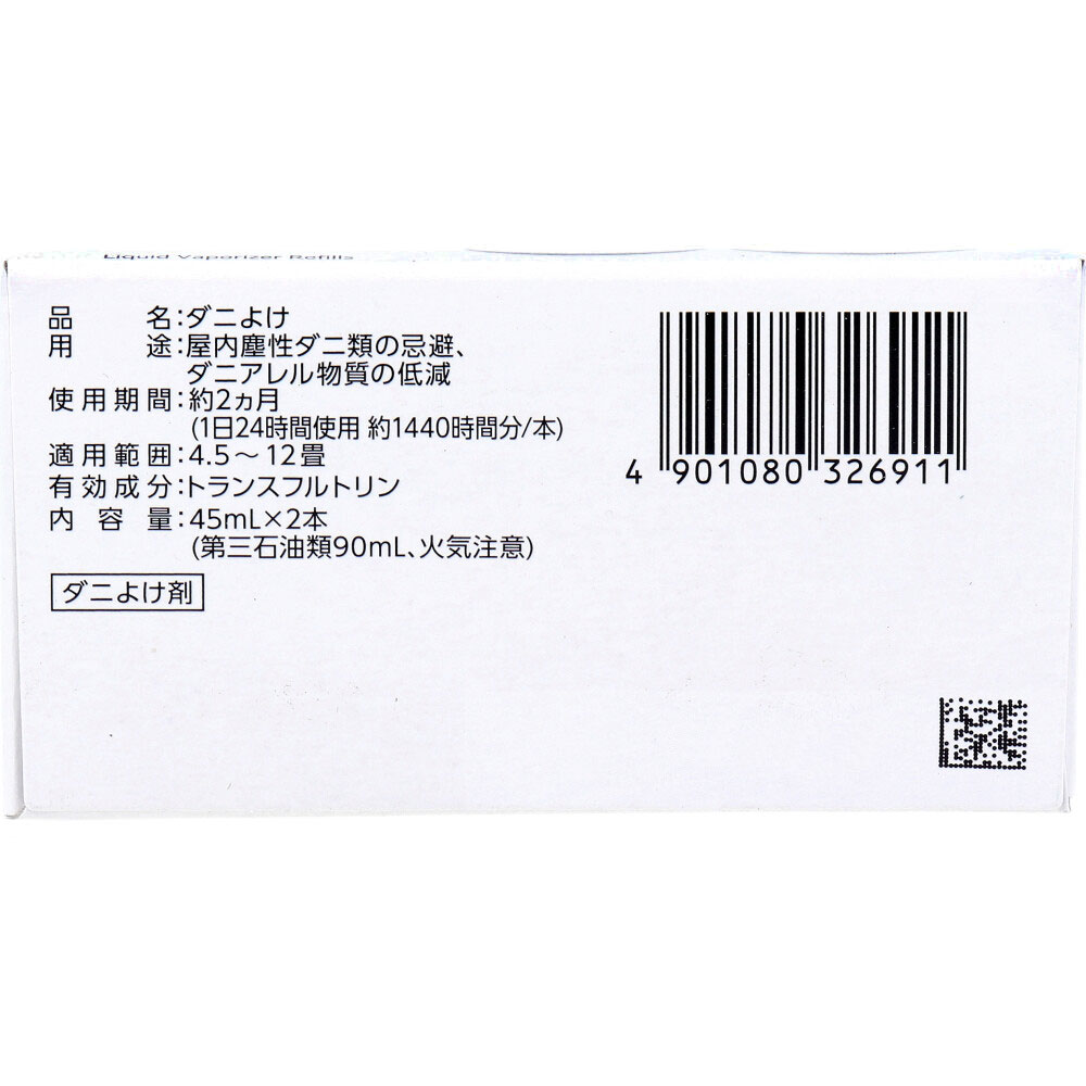 | 素材 | 【品名】 ダニよけ 【用途】 屋内塵性ダニ類の忌避、ダニアレル物質の低減 【使用期間】 約2ヵ月(1日24時間使用・約1440時間分) 【適用範囲】 4.5~12畳 【成分】 ★有効成分:トランスフルトリン 【内容量】 45mL×2本(第三石油類、火気注意) 【取替え方法】 ・ボトルを必ず下にしてまっすぐ下方に引っぱってください。はずしにくいときは、スイッチを入れて30分ほど器具を温めてからはずしてください。 |